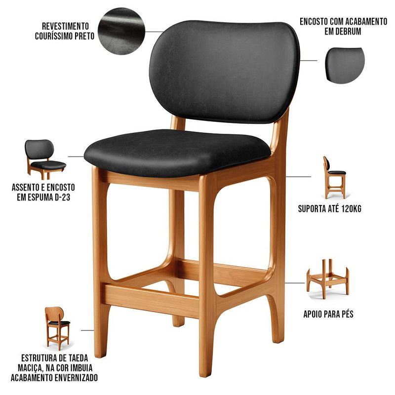 Amplamente sofisticada, a Banqueta Baixa Bar Cozinha Sala Jantar Betta L02 Imbuia Couríssimo Preto - Lyam Decor irá agregar ainda mais valor em sua decoração!! Sendo capaz de compor muito bem o ambiente, é produzida com materiais de excelente qualidade, a resistente estrutura em madeira de Taeda, na cor imbuia, conta com apoio para os pés (que garante maior segurança), além do assento e encosto estofados super confortáveis e convidativos, que são revestidos em tecido Couríssimo, composição extremamente elegante. Podendo ser disposta em bancada, cozinha americana, espaço gourmet ou home bar, as possibilidades de combinação são infinitas, o que a torna perfeita para receber família e amigos sempre de forma agradável e aconchegante, sem perder a sobriedade e requinte que possui. Você e seu lar merecem, adquira já a sua!! Dimensões do produto (L x A x P) 50 x 90 x 55 cm Medidas Internas: Altura do encosto: 34 cm Altura do chão ao assento: 65 cm Largura do assento: 50 cm Profundidade do assento: 40 cm Altura do chão ao apoio de pés: 16 cm Características: Estrutura em madeira maciça de Taeda, na cor Imbuia com acabamento envernizado. Revestimento em Couríssimo Preto de alta qualidade, com acabamento semi brilho. Assento e encosto com espuma D-23. Acabamento em debrum no encosto. Suporta até 120 kg. Produto entregue montado. - Por se tratar de estofado as medidas podem ter uma pequena variação de até 3 cm. - A tonalidade do produto real poderá ter ligeira variação devido o lote de tecidos. - A limpeza deve ser feita com pano umedecido em água limpa, sem esfregar, não utilizar produtos abrasivos, desengordurantes, álcool ou solvente. Observações importantes: - Produto para uso residencial em ambiente interno, não devendo ficar exposto diretamente ao sol, calor e umidade excessivos. - Pode haver alguma diferença de tonalidade entre a imagem e o produto real, por conta do tratamento de imagens e a calibração de cores do seu monitor. - As imagens são meramente ilustrativas, não acompanham objetos de decoração e eletrônicos. - Ao receber a mercadoria, o cliente deve verificar as condições da embalagem, caso haja alguma avaria não assine o comprovante de recebimento. - Montagem, desmontagem e outras instalações serão de responsabilidade do cliente. Não nos responsabilizamos, no ato da entrega, por subir escadas/elevadores ou pelo transporte por guincho em apartamentos. Eventuais despesas são de responsabilidade do comprador. - Confira as dimensões do produto e certifique-se de que passará normalmente por supostos elevadores, portas, escadas e/ou corredores de sua residência.