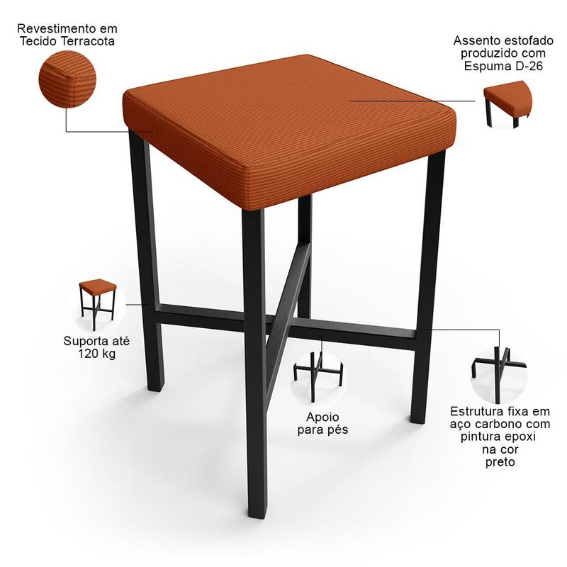 Transforme qualquer ambiente com a elegância e durabilidade com a Banqueta Stella! Com estrutura em ferro, ela é ideal para cozinhas, bares, áreas de lazer ou qualquer espaço que precise de um toque de sofisticação e modernidade. Sua versatilidade capacita o uso nos mais diversos ambientes como, cozinhas, bares, áreas de lazer, escritórios e muito mais. Adicione um toque de estilo e funcionalidade ao seu espaço com esta banqueta versátil e elegante. Aproveite já! Dimensões da Banqueta (L x A x P) 37 x 47 x 35 cm Medidas Internas: Altura do assento: 5 cm Largura do assento: 30 cm Profundidade do assento: 30 cm Altura do apoio de pés: 16 cm Características: Assento produzido com espuma D-26. Estrutura fixa em aço carbono com pintura epóxi na cor preto. Revestimento em Tecido Terracota. Suporta até 120 kg. - Por se tratar de estofado as medidas podem ter uma pequena variação de até 3 cm. - A tonalidade do produto real poderá ter ligeira variação devido o lote de tecidos. - A limpeza deve ser feita com pano levemente umedecido em água limpa, sem esfregar, não utilizar produtos abrasivos, desengordurantes, álcool ou solvente. Observações importantes: - Produto para uso residencial em ambiente interno, não devendo ficar exposto diretamente ao sol, calor e umidade excessivos. - Pode haver alguma diferença de tonalidade entre a imagem e o produto real, por conta do tratamento de imagens e a calibração de cores do seu monitor. - As imagens são meramente ilustrativas, não acompanham objetos de decoração e eletrônicos. - Ao receber a mercadoria, o cliente deve verificar as condições da embalagem, caso haja alguma avaria não assine o comprovante de recebimento. - Montagem, desmontagem e outras instalações serão de responsabilidade do cliente. Não nos responsabilizamos, no ato da entrega, por subir escadas/elevadores ou pelo transporte por guincho em apartamentos. Eventuais despesas são de responsabilidade do comprador. - Confira as dimensões do produto e certifique-se de que passará normalmente por supostos elevadores, portas, escadas e/ou corredores de sua residência.
