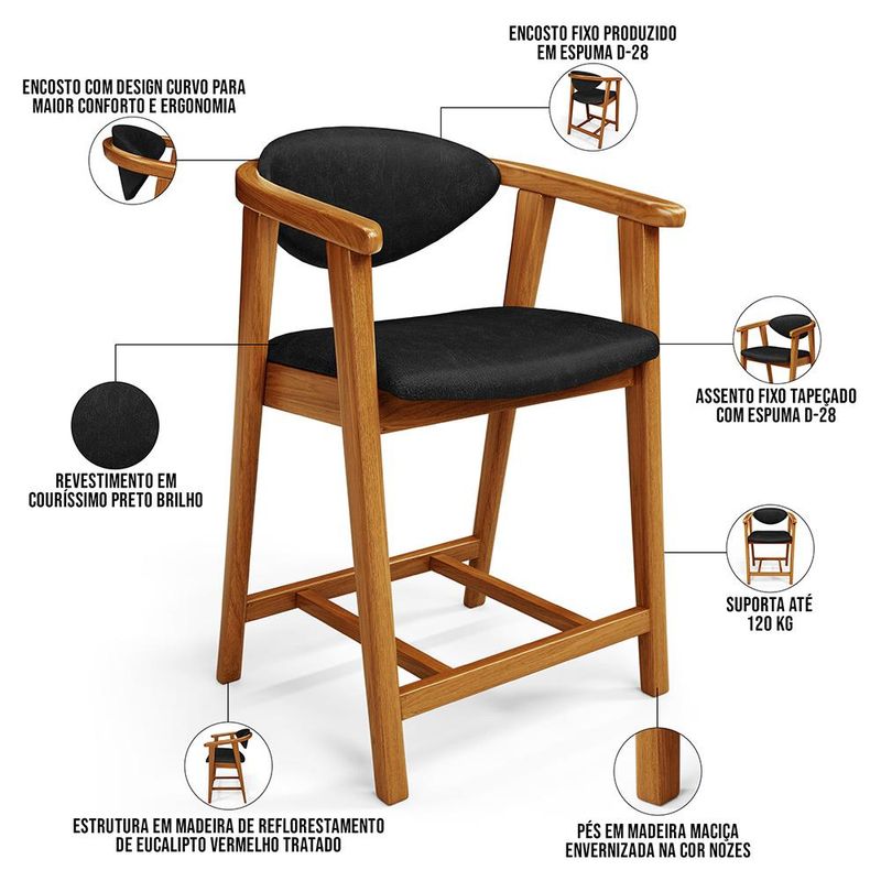 Crie um ambiente sofisticado e acolhedor com a Banqueta Baixa Cecília, da Lyam Decor. Com design moderno essa banqueta é uma peça muito versátil, pois você pode aproveitá-la em diversos ambientes, desde cozinha, sala de jantar, bancada até a área gourmet ou bar e, assim, agregar o máximo de beleza e conforto. Afinal, essa banqueta de madeira se destaca pela sua estrutura robusta que resistência e durabilidade. Já o assento estofado oferece o máximo conforto, enquanto o encosto proporciona suporte ergonômico sem igual. Combinando elegância e praticidade, essa banqueta baixa com encosto é perfeita para quem deseja um toque de requinte em qualquer ambiente. Adicione um charme especial ao seu lar com essa peça indispensável. Adicione ao seu carrinho e desfrute momentos de alegria com a Banqueta Cecília! Dimensões da Banqueta (L x A x P) 51 x 90 x 47 cm Medidas Internas: Altura do chão ao assento: 60 cm Assento livre (L x A x P): 44 x 4,5 x 46,5 cm Encosto livre (L x A): 41 x 22 cm Altura total do encosto: 33 cm Altura interna do braço: 18 cm Altura do chão ao início do braço: 76 cm Altura do chão ao apoio de pés: 17 cm Largura interna do apoio de pés: 27 cm Altura do apoio de pés: 4,5 cm Características: Estrutura em madeira de reflorestamento de eucalipto vermelho tratado. Revestimento em tecido Couríssimo de alta qualidade na cor Preto. Assento e encosto fixos tapeçados com espuma D-28. Encosto com design curvo para maior conforto e ergonomia. Pés em madeira maciça envernizada na cor Nozes. Peso suportado: Até 120 kg. - Nunca sentar nos braços ou encosto do produto. - Por se tratar de estofado as medidas podem ter uma pequena variação de até 3 cm. - A tonalidade do produto real poderá ter ligeira variação devido o lote de tecidos. - Indicado para uso residencial, sua limpeza deve ser feita com pano levemente umedecido em água limpa, sem esfregar, não utilizar produtos abrasivos, desengordurantes, álcool ou solvente. Observações importantes: - Produto para uso residencial em ambiente interno, não devendo ficar exposto diretamente ao sol, calor e umidade excessivos. - Pode haver alguma diferença de tonalidade entre a imagem e o produto real, por conta do tratamento de imagens e a calibração de cores do seu monitor. - As imagens são meramente ilustrativas, não acompanham objetos de decoração e eletrônicos. - Ao receber a mercadoria, o cliente deve verificar as condições da embalagem, caso haja alguma avaria não assine o comprovante de recebimento e entre em contato com nossa loja para orientações. - Montagem, desmontagem e outras instalações serão de responsabilidade do cliente. Não nos responsabilizamos, no ato da entrega, por subir escadas/elevadores ou pelo transporte por guincho em apartamentos. Eventuais despesas são de responsabilidade do comprador. - Confira as dimensões do produto e certifique-se de que passará normalmente por supostos elevadores, portas, escadas e/ou corredores de sua residência. - Para mais informações, acesse nossa Central de Atendimento.