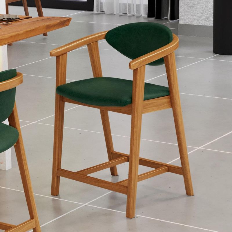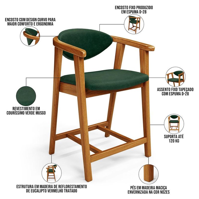Crie um ambiente sofisticado e acolhedor com a Banqueta Baixa Cecília, da Lyam Decor. Com design moderno essa banqueta é uma peça muito versátil, pois você pode aproveitá-la em diversos ambientes, desde cozinha, sala de jantar, bancada até a área gourmet ou bar e, assim, agregar o máximo de beleza e conforto. Afinal, essa banqueta de madeira se destaca pela sua estrutura robusta que resistência e durabilidade. Já o assento estofado oferece o máximo conforto, enquanto o encosto proporciona suporte ergonômico sem igual. Combinando elegância e praticidade, essa banqueta baixa com encosto é perfeita para quem deseja um toque de requinte em qualquer ambiente. Adicione um charme especial ao seu lar com essa peça indispensável. Adicione ao seu carrinho e desfrute momentos de alegria com a Banqueta Cecília! Dimensões da Banqueta (L x A x P) 51 x 90 x 47 cm Medidas Internas: Altura do chão ao assento: 60 cm Assento livre (L x A x P): 44 x 4,5 x 46,5 cm Encosto livre (L x A): 41 x 22 cm Altura total do encosto: 33 cm Altura interna do braço: 18 cm Altura do chão ao início do braço: 76 cm Altura do chão ao apoio de pés: 17 cm Largura interna do apoio de pés: 27 cm Altura do apoio de pés: 4,5 cm Características: Estrutura em madeira de reflorestamento de eucalipto vermelho tratado. Revestimento em tecido Couríssimo de alta qualidade na cor Verde Musgo. Assento e encosto fixos tapeçados com espuma D-28. Encosto com design curvo para maior conforto e ergonomia. Pés em madeira maciça envernizada na cor Nozes. Peso suportado: Até 120 kg. - Nunca sentar nos braços ou encosto do produto. - Por se tratar de estofado as medidas podem ter uma pequena variação de até 3 cm. - A tonalidade do produto real poderá ter ligeira variação devido o lote de tecidos. - Indicado para uso residencial, sua limpeza deve ser feita com pano levemente umedecido em água limpa, sem esfregar, não utilizar produtos abrasivos, desengordurantes, álcool ou solvente. Observações importantes: - Produto para uso residencial em ambiente interno, não devendo ficar exposto diretamente ao sol, calor e umidade excessivos. - Pode haver alguma diferença de tonalidade entre a imagem e o produto real, por conta do tratamento de imagens e a calibração de cores do seu monitor. - As imagens são meramente ilustrativas, não acompanham objetos de decoração e eletrônicos. - Ao receber a mercadoria, o cliente deve verificar as condições da embalagem, caso haja alguma avaria não assine o comprovante de recebimento e entre em contato com nossa loja para orientações. - Montagem, desmontagem e outras instalações serão de responsabilidade do cliente. Não nos responsabilizamos, no ato da entrega, por subir escadas/elevadores ou pelo transporte por guincho em apartamentos. Eventuais despesas são de responsabilidade do comprador. - Confira as dimensões do produto e certifique-se de que passará normalmente por supostos elevadores, portas, escadas e/ou corredores de sua residência. - Para mais informações, acesse nossa Central de Atendimento.