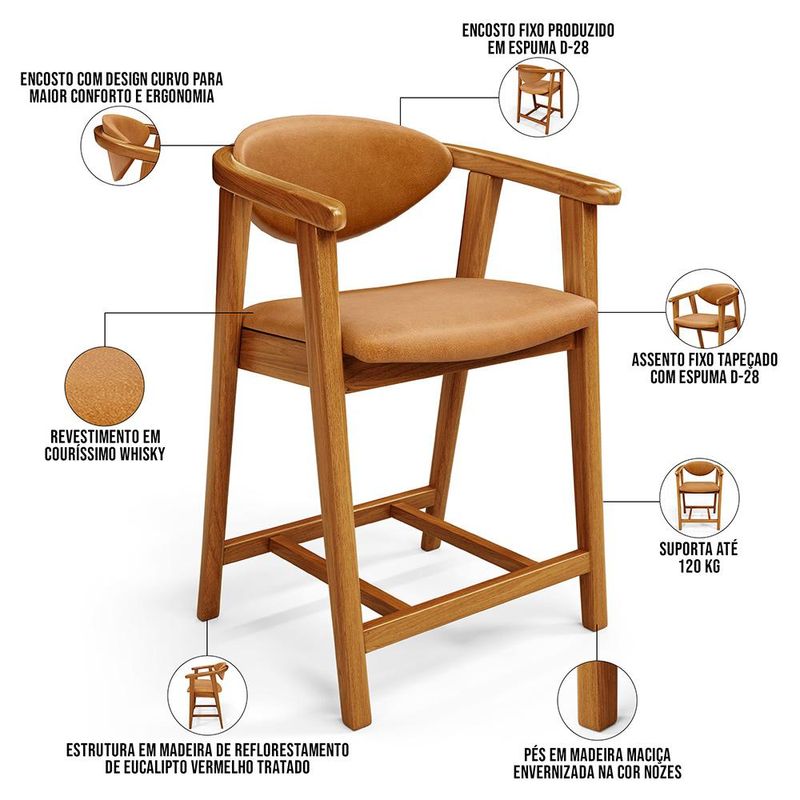 Crie um ambiente sofisticado e acolhedor com a Banqueta Baixa Cecília, da Lyam Decor. Com design moderno essa banqueta é uma peça muito versátil, pois você pode aproveitá-la em diversos ambientes, desde cozinha, sala de jantar, bancada até a área gourmet ou bar e, assim, agregar o máximo de beleza e conforto. Afinal, essa banqueta de madeira se destaca pela sua estrutura robusta que resistência e durabilidade. Já o assento estofado oferece o máximo conforto, enquanto o encosto proporciona suporte ergonômico sem igual. Combinando elegância e praticidade, essa banqueta baixa com encosto é perfeita para quem deseja um toque de requinte em qualquer ambiente. Adicione um charme especial ao seu lar com essa peça indispensável. Adicione ao seu carrinho e desfrute momentos de alegria com a Banqueta Cecília! Dimensões da Banqueta (L x A x P) 51 x 90 x 47 cm Medidas Internas: Altura do chão ao assento: 60 cm Assento livre (L x A x P): 44 x 4,5 x 46,5 cm Encosto livre (L x A): 41 x 22 cm Altura total do encosto: 33 cm Altura interna do braço: 18 cm Altura do chão ao início do braço: 76 cm Altura do chão ao apoio de pés: 17 cm Largura interna do apoio de pés: 27 cm Altura do apoio de pés: 4,5 cm Características: Estrutura em madeira de reflorestamento de eucalipto vermelho tratado. Revestimento em tecido Couríssimo de alta qualidade na cor Whisky. Assento e encosto fixos tapeçados com espuma D-28. Encosto com design curvo para maior conforto e ergonomia. Pés em madeira maciça envernizada na cor Nozes. Peso suportado: Até 120 kg. - Nunca sentar nos braços ou encosto do produto. - Por se tratar de estofado as medidas podem ter uma pequena variação de até 3 cm. - A tonalidade do produto real poderá ter ligeira variação devido o lote de tecidos. - Indicado para uso residencial, sua limpeza deve ser feita com pano levemente umedecido em água limpa, sem esfregar, não utilizar produtos abrasivos, desengordurantes, álcool ou solvente. Observações importantes: - Produto para uso residencial em ambiente interno, não devendo ficar exposto diretamente ao sol, calor e umidade excessivos. - Pode haver alguma diferença de tonalidade entre a imagem e o produto real, por conta do tratamento de imagens e a calibração de cores do seu monitor. - As imagens são meramente ilustrativas, não acompanham objetos de decoração e eletrônicos. - Ao receber a mercadoria, o cliente deve verificar as condições da embalagem, caso haja alguma avaria não assine o comprovante de recebimento e entre em contato com nossa loja para orientações. - Montagem, desmontagem e outras instalações serão de responsabilidade do cliente. Não nos responsabilizamos, no ato da entrega, por subir escadas/elevadores ou pelo transporte por guincho em apartamentos. Eventuais despesas são de responsabilidade do comprador. - Confira as dimensões do produto e certifique-se de que passará normalmente por supostos elevadores, portas, escadas e/ou corredores de sua residência. - Para mais informações, acesse nossa Central de Atendimento.