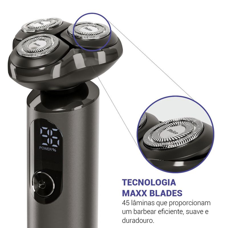 Imagine um barbear perfeito, rápido e confortável, a qualquer hora e em qualquer lugar!O Barbeador Elétrico Philco PBA11A é a solução ideal para quem busca praticidade e um resultado impecável. Com ele, você conquista um barbear suave e rente, sem irritações, e ainda economiza tempo.Ele é à prova d'água, permitindo um barbear refrescante no chuveiro, conta com uma bateria de lítio de alta performance, proporcionando até 1 hora de uso contínuo. Além disso, sua versatilidade é garantida pela voltagem bivolt, ideal para viagens.Sinta a diferença de um barbear preciso e rente com as 3 lâminas individuais e flutuantes, que se adaptam perfeitamente aos contornos do seu rosto. Tudo isso, com tecnologia Maxx Blades, com suas 45 lâminas, garante um deslizamento suave e eficiente, removendo até pelos mais curtos. O display digital fornece informações claras sobre o funcionamento e o nível de bateria, para que você tenha total controle sobre o seu barbear.Adquira agora o Barbeador Elétrico Philco PBA11A e experimente um novo nível de conforto e praticidade. Com ele, você estará sempre bem cuidado e pronto para qualquer ocasião!• Tipo de bateria: Lítio ¬600mAh • Tempo de funcionamento: 1h • Tempo de carga: 80min • Lâminas que se ajustam ao rosto• Luz indicadora de funcionamento • Luz indicadora de carregamento • Indicador de nível de bateria • Pode ser usado com pele seca • Pode ser usado com pele úmida • Pode ser usado com pele molhada • Funcionamento com fio • Funcionamento sem fio • Acessórios: Capa Protetora, escova de limpeza e cabo USB tipo C• Resistente à água / A prova d'água IPX7.