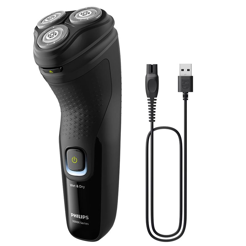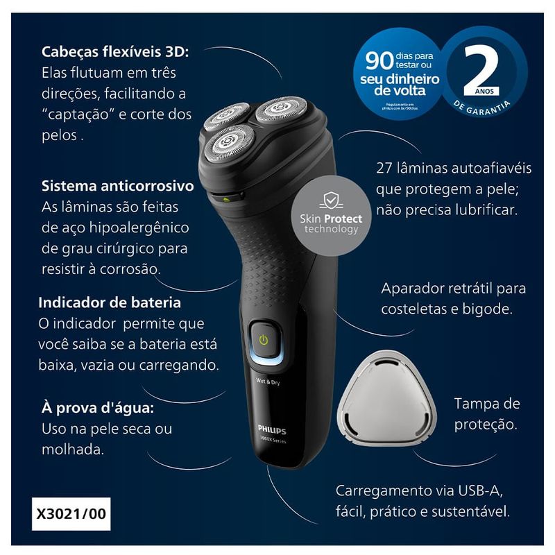 O barbeador Philips 3000X oferece um barbear rápido e confortável. As 27 lâminas autoafiáveis para uso seco ou molhado e o aparador retrátil tornam o barbeador fácil de usar e proporcionam um excelente resultado. Possui 2 anos de garantia e 90 dias para testar.Lâminas ComfortCut As 27 lâminas autoafiáveis cortam confortavelmente os pelos bem rente à pele, proporcionando acabamento suave e uniforme, sempre. As lâminas autoafiáveis permanecem novas por 2 anos.Sistema de corte anticorrosão As lâminas do barbeador são feitas de aço cirúrgico hipoalergênico para resistir à corrosão, evitar impurezas e proteger sua pele.40 minutos de uso sem fio (1 hora de carregamento) Em apenas uma hora, a bateria durável NiMH fica totalmente carregada para você se barbear por 13 vezes. Está com pressa? Uma carga rápida de 5 minutos fornece energia suficiente para você se barbear uma vez.Barbear a seco e com a pele molhada Escolha entre um prático barbear a seco ou um refrescante barbear úmido com gel ou espuma, até mesmo debaixo do chuveiro.Aparador retrátil Refine e defina o bigode e as costeletas com o aparador retrátil e complete seu visual com facilidade.Formato que cabe na mão Nunca perca a sua pega. O cabo ergonômico em borracha proporciona conforto e segurança, mesmo quando molhado.Cabeças flutuantes 3D As cabeças flutuantes movem-se livremente em três direções para manter o contato com as curvas do rosto, sem cortar a pele.Abertura com um único toque Para abrir a cabeça do barbeador e lavá-la em água corrente, basta tocar em um botão.Indicador de carga da bateria Não seja pego de surpresa por uma bateria vazia. O indicador da bateria permite que você saiba se a bateria está fraca, vazia ou sendo carregadaCarregamento USB-ANa Philips, impulsionamos a sustentabilidade em todos os aspectos da criação de produtos.Nossa ambição é diminuir o desperdício e reduzir o número de adaptadores USB quecolocamos no mercado."CaracterísticasUso: Uso MolhadoTipo: BarbeadoresVelocidades: 01Quantidade de Lâmina/Pente: Tampa de proteção Aparador retrátil incluídoLâminas HipoalergênicasRemove os Pelos pela RaizPortátilLavávelIndicador de CargaSistema GiratórioRecarregávelUso/Operação: sem FioEspecificações TécnicasModelo: X3021/00Voltagem: BivoltCor: PretoEAN: 8720689024693Garantia: 24 mesesDimensões e PesoDimensões do produto sem embalagem (AxLxP): 190x100x80 mmDimensões do produto com embalagem (AxLxP): 205x169x209 mmPeso do produto sem embalagem: 0,32 KgPeso do produto com embalagem: 0,42 KgItens Inclusos01 Barbeador01 Tampa de proteção Aparador retrátil incluído