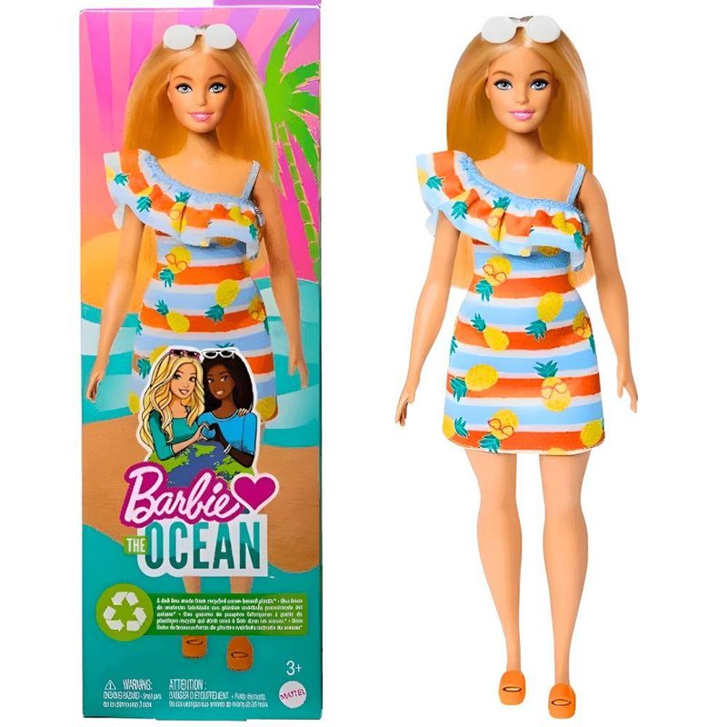 Seja bem-vindo(a) a Loja NIVALMIX, Essas bonecas estão prontas para irem a praia comemorar o aniversário de 50 anos de Malibu. E o melhor de tudo é que essas bonecas são feitas com material reciclável ! Elas são totalmente ecológicas! A coleção Barbie Loves the Ocean apresenta diversas bonecas, tecidos e acessórios feitos de materiais reciclados e plásticos provenientes dos oceanos. Ela está pronta para o verão com um lindo vestido de verão com estampa tropical laranja e amarelo! Desde passear no calçadão da praia até assistir a um churrasco no quintal, seu visual alegre e versátil pode inspirar as crianças a sonhar com todos os tipos de histórias de verão! Barbie Loves the Ocean não só oferece às crianças uma oportunidade de brincar ao sol, mas também pode incentivar o amor pela proteção do planeta e de seus oceanos desde cedo! Especificações • Marca: Mattel • Referência: GRB35 • Idade Recomendada: +3 anos • Material: Plástico • Cor: Colorida • Loira • Garantia do Fornecedor: 03 meses contra defeitos de fabricação • Validade: Indeterminada Itens Inclusos: • 01 Barbie Ecológica Love The Ocean Produto Certificado – Compulsório Registro Inmetro: INNAC 005141/2021 OCP 0061 *As cores podem variar entre as imagens mostradas acima e o produto. Imagens meramente ilustrativas. *Só comercializamos produtos novos, originais e lacrados em caixa.