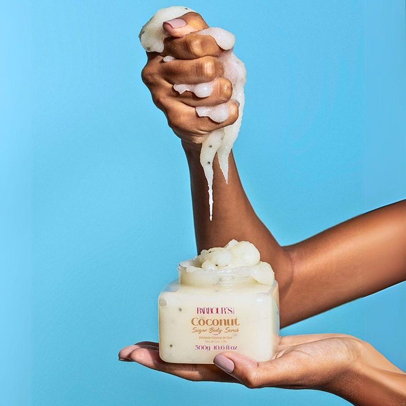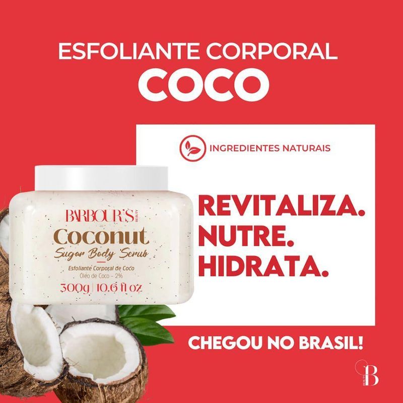Barbour's Beauty Coconut Sugar Body Scrub - Esfoliante Corporal 300gO Barbour's Beauty Coconut Sugar Body Scrub 300g é um esfoliante corporal que combina ingredientes naturais para uma esfoliação suave e eficaz. Lançado em 2024 pela Barbour's Beauty, marca brasileira reconhecida por fragrâncias únicas, este produto remove células mortas, promovendo renovação celular e deixando a pele macia, hidratada e radiante. Formulado com óleo de coco e cristais de açúcar, hidrata profundamente sem oleosidade, enquanto o aroma tropical de coco revitaliza os sentidos. Ideal para todos os tipos de pele, sua textura cremosa transforma a rotina de cuidados em uma experiência sensorial luxuosa. A embalagem prática com tampa de rosca facilita o uso no banho.CaracterísticasMarca: Barbour's BeautyLinha: Coconut SugarCategoria: Esfoliante CorporalVersão: ScrubBenefícios: Esfoliação suave, hidratação profunda, renovação celular, pele radianteComponentes Principais: Pote de 300g com óleo de coco e cristais de açúcarModo de Aplicação: Aplique uma quantidade generosa na pele úmida durante o banho. Massageie em movimentos circulares, focando em áreas ásperas como cotovelos e joelhos. Enxágue com água. Use 1-2 vezes por semana. Para melhores resultados, combine com o creme hidratante da linha Coconut da Barbour's Beauty.Especificações do ProdutoTipo de Produto: Esfoliante CorporalIndicação: Todos os tipos de pele, incluindo sensíveisPropriedades: Esfoliante, hidratante, nutritivoTextura: Cremosa com grânulos de açúcarResultados: Pele macia, hidratada, renovada, com brilho saudávelIngredientes Principais: Óleo de Coco (hidratante, antioxidante), Sucrose/Açúcar (esfoliante natural), Glicerina (umectante)Lista de Ingredientes: Sucrose, Aqua / Water / Eau, Glycerin, Cocos Nucifera (Coconut) Oil, Propylene Glycol, Polysorbate 20, Phenoxyethanol, Parfum / Fragrance, Isopropyl Myristate, Benzyl Salicylate, Linalool, Hexyl CinnamalCertificação: Conforme padrões internacionais de cosméticos; testado dermatologicamenteVolume: 300gFamília Olfativa: TropicalPaís/Região de Origem: BrasilBenefícios do ProdutoEficácia: Remove células mortas, hidrata e suaviza a pele, promovendo renovação e brilho natural.Durabilidade: O pote de 300g rende cerca de 2-3 meses com uso semanal (1-2 vezes por semana), dependendo da área de aplicação.Versatilidade: Indicado para todos os tipos de pele, ideal para uso no banho, especialmente em áreas ressecadas ou ásperas.Design ou Praticidade: Embalagem de 300g com tampa de rosca, textura cremosa fácil de aplicar, enxágue sem resíduos oleosos.O Barbour's Beauty Coconut Sugar Body Scrub 300g é perfeito para quem busca uma esfoliação eficaz com hidratação profunda. Com óleo de coco e açúcar, remove células mortas, deixando a pele macia, radiante e com um delicado aroma tropical. Fácil de usar, transforma o banho em um momento de cuidado e bem-estar, ideal para todos os tipos de pele.Tipos de Pele - Pele de Todos os TiposNavegue por - Cosméticos Veganos Cosméticos Cruelty-FreeLinha - Coconut Sugar Body ScrubNome do produto - Barbour's Beauty Coconut Sugar Body Scrub