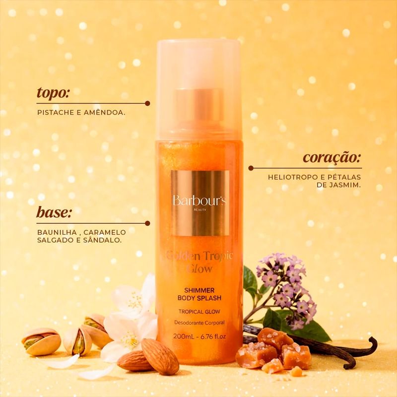 Barbour s Beauty Golden Tropic Glow é um body splash desodorante corporal desenvolvido para perfumar suavemente a pele enquanto proporciona sensacao refrescante e bem estar ao longo do dia. Sua fragrancia luminosa e tropical envolve o corpo com acordes alegres e ensolarados, criando uma aura vibrante ideal para quem aprecia aromas leves, radiantes e descontraidos. Perfeito para reaplicacoes frequentes, este body splash oferece perfumacao delicada sem sobrecarregar, acompanhando rotinas diurnas, momentos de lazer ou dias quentes com conforto e frescor prolongados. Golden Tropic Glow transforma o cuidado diario em uma experiencia sensorial envolvente, deixando a pele perfumada, revitalizada e pronta para qualquer ocasiao casual. Caracteristicas: Marca: Barbour s Beauty Linha: Golden Tropic Glow Categoria: Body Splash Desodorante Versao: Golden Tropic Glow 200ml Beneficios: perfumacao leve, frescor imediato, aroma tropical e facil reaplicacao Ingredientes Principais: essencias tropicais, acordes frutados e notas adocicadas Modo de Aplicacao: Borrife diretamente sobre a pele limpa e seca, mantendo distancia de aproximadamente 15cm. Reaplique sempre que desejar intensificar a fragrancia ou renovar a sensacao de frescor ao longo do dia. Especificacoes do Produto: Familia Olfativa: Frutado, Floral Genero: nao aplicavel Concentracao: body splash Ocasião: Dia a Dia, Lazer, Clima Quente, Verao, Atividades ao Ar Livre Notas de Topo: frutas tropicais, coco Notas de Coracao: flores brancas, jasmim Notas de Fundo: baunilha, almíscar Beneficios do Produto: Eficacia: perfuma suavemente a pele com aroma tropical refrescante. Durabilidade: fragrancia moderada com necessidade de reaplicacao ao longo do dia. Versatilidade: ideal para uso diario, momentos de lazer e dias quentes. Design ou Praticidade: frasco de 200ml perfeito para uso frequente e levar na bolsa de praia ou academia. Barbour s Beauty Golden Tropic Glow é ideal para quem busca uma fragrancia corporal leve e ensolarada para acompanhar a rotina, proporcionando frescor continuo, toque tropical e sensacao agradavel em cada aplicacao.