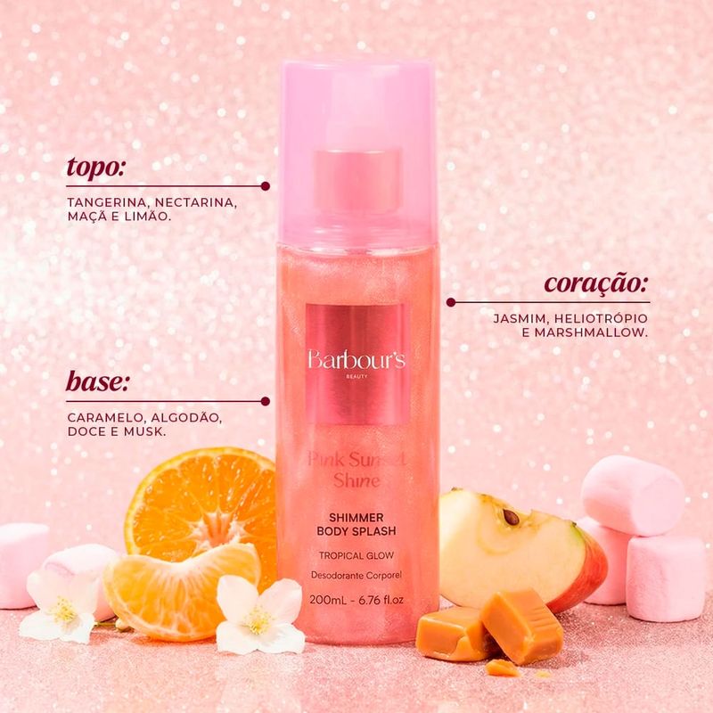 Barbour s Beauty Pink Sunset Shine é um body splash criado para envolver a pele com uma fragrancia leve, feminina e luminosa, perfeita para acompanhar a rotina diaria com frescor e suavidade. Sua composicao combina acordes frutados delicados com notas florais radiantes, resultando em uma experiencia sensorial alegre e confortavel que perfuma sem sobrecarregar. Ideal para reaplicacoes ao longo do dia, este body splash proporciona sensacao refrescante imediata e perfumacao sutil que combina com momentos de lazer, dias quentes ou encontros casuais. Pink Sunset Shine transforma o cuidado corporal em um ritual perfumado envolvente, deixando a pele suavemente aromatizada, revitalizada e com toque delicado em cada aplicacao. Caracteristicas: Marca: Barbour s Beauty Linha: Pink Sunset Shine Categoria: Body Splash Versao: Pink Sunset Shine 200ml Beneficios: perfumacao leve, frescor imediato, aroma frutado floral e facil reaplicacao Ingredientes Principais: acordes frutados, essencias florais e notas adocicadas suaves Modo de Aplicacao: Borrife diretamente sobre a pele limpa e seca, mantendo distancia aproximada de 15cm. Reaplique sempre que desejar intensificar a fragrancia ou renovar a sensacao de frescor ao longo do dia. Especificacoes do Produto: Familia Olfativa: Floral, Frutado Genero: nao aplicavel Concentracao: body splash Ocasião: Dia a Dia, Lazer, Clima Quente, Verao, Encontros Casuais Notas de Topo: frutas vermelhas, mandarina Notas de Coracao: flores rosadas, jasmim Notas de Fundo: baunilha suave, almíscar Beneficios do Produto: Eficacia: perfuma suavemente a pele com aroma delicado e luminoso. Durabilidade: fragrancia moderada com necessidade de reaplicacao ao longo do dia. Versatilidade: ideal para uso diario, lazer e dias quentes. Design ou Praticidade: frasco de 200ml perfeito para reaplicacoes frequentes e uso continuo. Barbour s Beauty Pink Sunset Shine é ideal para quem busca uma fragrancia corporal leve e alegre para acompanhar a rotina, proporcionando frescor constante, suavidade e sensacao agradavel em cada aplicacao.