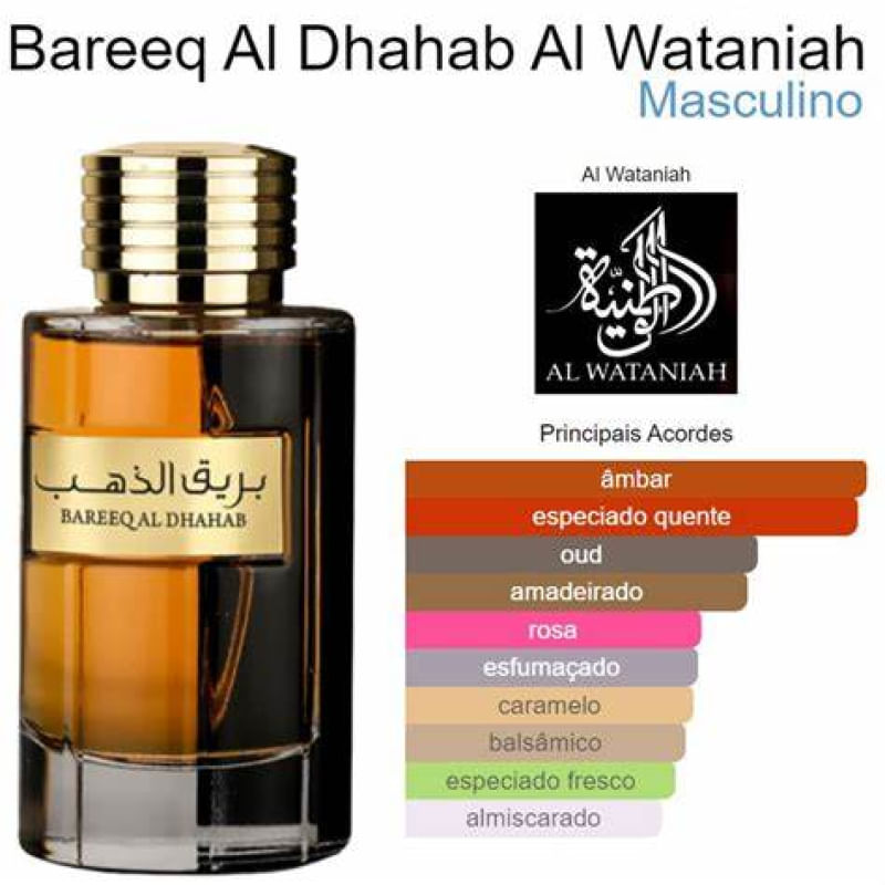 AL WATANIAH Bareeq Al Dhahab de Al Wataniah é um perfume Oriental Masculino. Esta é uma nova fragrância. Bareeq Al Dhahab foi lançada em 2022. As notas de topo são: Rosa, Açafrão e Pimenta. As notas de coração são: Agarwood (Oud), Caramelo, Patchouli e Notas Florais. As notas de fundo são: Incenso, Âmbar, Notas Amadeiradas e Almíscar.