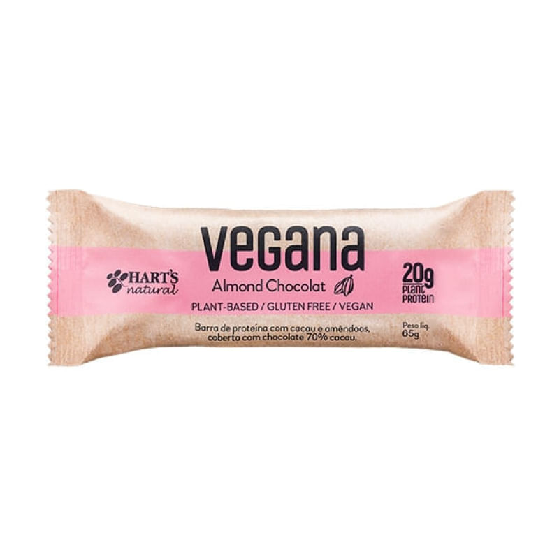 A Barra de Proteína Vegana Almond Chocolat, 65g, da Hart’s Natural, possui um sabor de cacau e amêndoas. Oferece alto teor de proteínas (20g por unidade), além de ser uma barrinha natural e coberta com chocolate 70% cacau. É livre de conservantes, isenta de lactose, sem glúten e além disso possui certificação de alimento vegano.