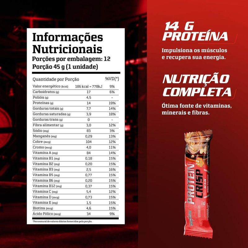 Barra Proteína Whey Crisp Bar 12 Unidades - Integralmedica Peanut ButterDeu vontade de comer doce sem sair da dieta? Protein Crisp Integralmédica é a barra de proteína com 13 g de proteína e baixa caloria. . Ótima fonte de vitaminas, minerais e fibras, ajuda a saciar a fome e evitar o catabolismo.Contém Glúten?: Não Contém | Lactose: Contém | Tipo de supemento: Proteína Hidrolisada | Tamanho: 45g | Formato do : Barra | Sabor: Variado | Classe de : Proteína | Ingredient list: BLEND PROTEICO [PROTEÍNA CONCENTRADA DO LEITE, PROTEÍNA CONCENTRADA DO SORO DE LEITE E PROTEÍNA HIDROLISADA (COLÁGENO)], PASTA DE AMENDOIM | Formulário de item: Tábua | Alimentos contendo enzimas e probióticos: Não | Marca: Integralmedica | Função do : Nutricional/Esportivo | Código de registro sanitário da Anvisa: 185/24 | Sabor: Peanut Butter