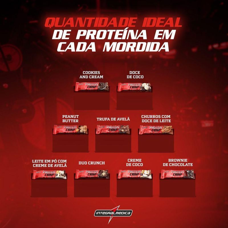 Barra Proteína Whey Crisp Bar 12 Unidades - Integralmedica Trufa De AvelãDeu vontade de comer doce sem sair da dieta? Protein Crisp Integralmédica é a barra de proteína com 13 g de proteína e baixa caloria. . Ótima fonte de vitaminas, minerais e fibras, ajuda a saciar a fome e evitar o catabolismo.Contém Glúten?: Não Contém | Lactose: Contém | Tipo de supemento: Proteína Hidrolisada | Tamanho: 45g | Formato do : Barra | Sabor: Variado | Classe de : Proteína | Ingredient list: BLEND PROTEICO [PROTEÍNA CONCENTRADA DO LEITE, PROTEÍNA CONCENTRADA DO SORO DE LEITE E PROTEÍNA HIDROLISADA (COLÁGENO)], PASTA DE AMENDOIM | Formulário de item: Tábua | Alimentos contendo enzimas e probióticos: Não | Marca: Integralmedica | Função do : Nutricional/Esportivo | Código de registro sanitário da Anvisa: 185/24 | Sabor: Trufa de Avelã