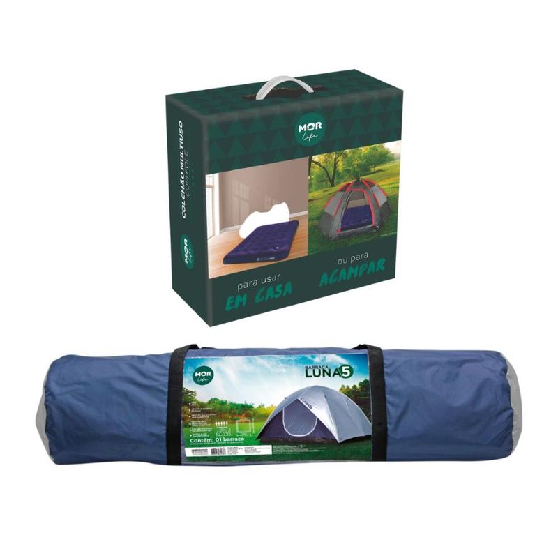Barraca Iglu Luna 5 Lugares e Colchão Casal MorConfortável, moderna e segura, a Barraca Luna da Mor vem com uma proteção extra contra vazamentos: o sobreteto vai até o chão e é inteiramente revestido em silvercoating (material prata) que, além de deixar a barraca mais bonita, reflete a luz solar, diminuindo o calor no seu interior. Ainda, para maior proteção, o FPS é 100! Além disso, apresenta mosquiteiro na porta, no teto e na janela traseira e local para pendurar lanterna dentro da barraca. Este produto é próprio para 5 pessoas.Já o Colchão Multiuso Casal Mor é feito em PVC resistente, possui superfície aveludada e ondulações que garantem conforto, além de inflador acoplado, válvula de enchimento seguro, kit de reparo e embalagem compacta com alça. Mede 1,91m x 1,37m x 22cm e suporta até 160 kg.Descrição:Barraca Iglu Luna 5 LugaresConteúdo da Embalagem: 1 Barraca, 1 Sacola de Transporte + Manual de Instruções.Coluna D´Água 800mm.Proteção FPS 100 contra raios solares.Sobreteto até o chão com silvercoating (reflete luz solar e reduz calor).Mosquiteiro na porta, teto e janela traseira.Suporte interno para lanterna.Medidas: 2,40m x 2,40m x 1,40m.Capacidade: 5 pessoasATENÇÃO: A barraca não protege 100% da chuva.Colchão Multiuso Casal MorConteúdo da Embalagem: 1 Colchão Inflável Casal + Manual de Instruções.Produzido em PVC resistente com superfície aveludada.Ondulações anatômicas para maior conforto.Inflador acoplado com sistema de fole.Válvula de enchimento seguro e rápido esvaziamento.Compacto, com embalagem prática e kit de reparo.Medidas: 1,91m x 1,37m x 22cm.Capacidade: até 160 kg.Imagens meramente ilustrativas, todos os itens que ambientam o produto não estão inclusos.