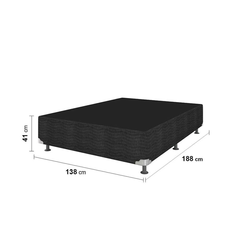 Qualidade e sustentabilidadeA Base Box Casal Ortobom Evidence A40 é a escolha perfeita para quem busca qualidade e resistência. Produzida com madeira de reflorestamento, a Ortobom reafirma seu compromisso com a sustentabilidade, garantindo um produto que alia durabilidade e respeito ao meio ambiente. Com medidas de 41x188x138cm, essa base é ideal para qualquer ambiente, proporcionando conforto e segurança para o seu colchão casal.Elegância e acabamentoRevestida em tecido de poliéster, a Base Box Ortobom Evidence A40 oferece um acabamento elegante e sofisticado, complementando a decoração do quarto com estilo. Desenvolvida especialmente para ser compatível com os Colchões Ortobom, ela se destaca não apenas pela estética, mas também pela funcionalidade. O jogo de pés em PVC reforça sua estabilidade, suportando até 100kg de forma eficiente.Proteção e durabilidadePensada para proporcionar uma experiência completa, a base conta com tratamentos especiais Antiácaro, Antialérgico, Antimofo e Anticupim, garantindo maior durabilidade e proteção à saúde. Assim, a Base Box Ortobom Evidence A40 se torna a opção perfeita para quem valoriza segurança, conforto e resistência no cuidado com o colchão e o bem-estar.