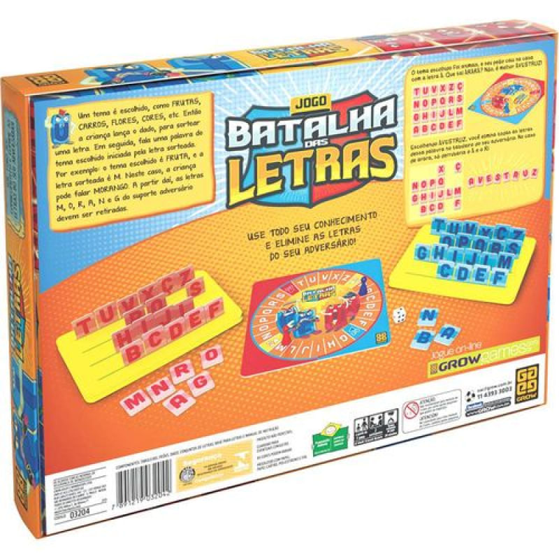 Jogo de Tabuleiro - Batalha Das Letras - Vermelho - GROWO Jogador Deve Usar todo Conhecimento Para Eliminar As Letras Do Seu Adversário! No Jogo Batalha Das Letras Da Grow Um Tema é Escolhido, Como Frutas, Carros, Flores, Cores e etc, Então a Criança Lança o Dado, Para Sortear Uma Letra Em Seguida, Fala Uma Palavra Do Tema Escolhido Iniciada Pela Letra Sorteada Por Exemplo: O Tema Escolhido é Fruta, e a Letra Sorteada é M Neste Caso, a Criança Pode Falar Morango A Partir Daí, As Letras M, O, R ,A, N,G,O, Do Suporte Adversário Devem Ser RetiradasDetalhes: Certificação: Certificado Pelos Órgãos Autorizados - OCP`S(Organismos De Certificação De Produtos) Código De Certificação: CE-BRI/ICEPEX-N 01024-25 300/2004 OCP 0046 Características: Conteúdo da Embalagem: 1 Jogo Batalha das Letras Material/Composição: papel cartão,Plastico Ref: 03204 Marca:Grow Modelo:Batalha das Palavras Idade Indicada:7+ Código de Barras: 7891219032042 Aviso: As cores podem variar entre as imagens mostradas acima e o produto Imagens meramente ilustrativas Garantia: 03 Meses Contra Defeito De fabrica