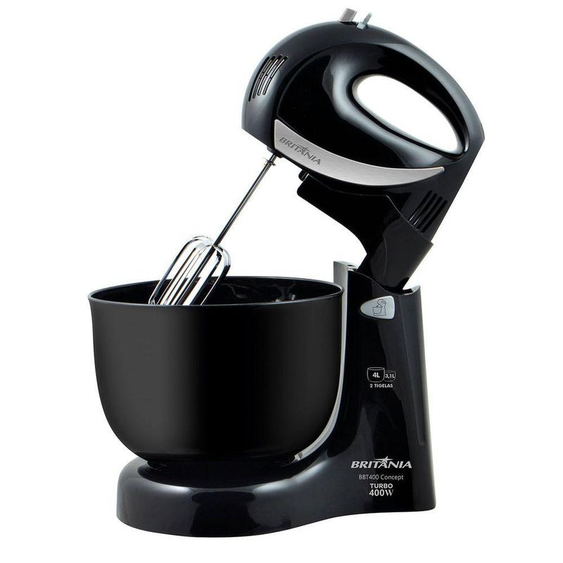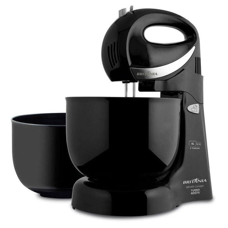 Batedeira Britânia BBT400P Concept Preto 400W 220VPrepare massas leves, claras em neve, molhos e muito mais com a Batedeira Britânia BBT400P Concept Preto 400W!O espaço que você precisa para preparos simultâneos, isso porque você terá 2 tigelas à sua disposição.Misture e bata com maior eficiência! São 400W de potência para suas receitas.Maior liberdade na cozinha. A Batedeira Britânia BBT400P pode ser utilizada tanto como fixa quanto portátil!Principais Características- Potência 400W- 4 velocidades + Turbo- 2 tigelas de plástico com capacidade para 3,1L e 4L- Batedores em aço inox para massas leves- Botão ejetor dos batedores- Garantia de 1 ano- Unidade motora pode ser usada fora da base (pode ser usada como portátil)Observação: Somente faturamos para o nosso consumidor final, ou seja, não faturamos pedidos para CNPJ por este portal de vendas.Especificações TécnicasMarca: BritâniaModelo: BBT400PCor: PretoTipo: ComumEstado: NovoTigela extra: SimCapacidade da tigela: 4 LCapacidade da tigela extra: 3,1 LPotência: 400 WVelocidades: 4Batedores: 1 parAltura do produto: 31,4 cmLargura do produto: 33,6 cmComprimento do produto: 23 cmPeso do produto: 1,515 kgAltura com embalagem: 27,5 cmLargura com embalagem: 30,8 cmComprimento com embalagem: 22,4 cmPeso com embalagem: 1,733 kgGarantia: 360 Dias