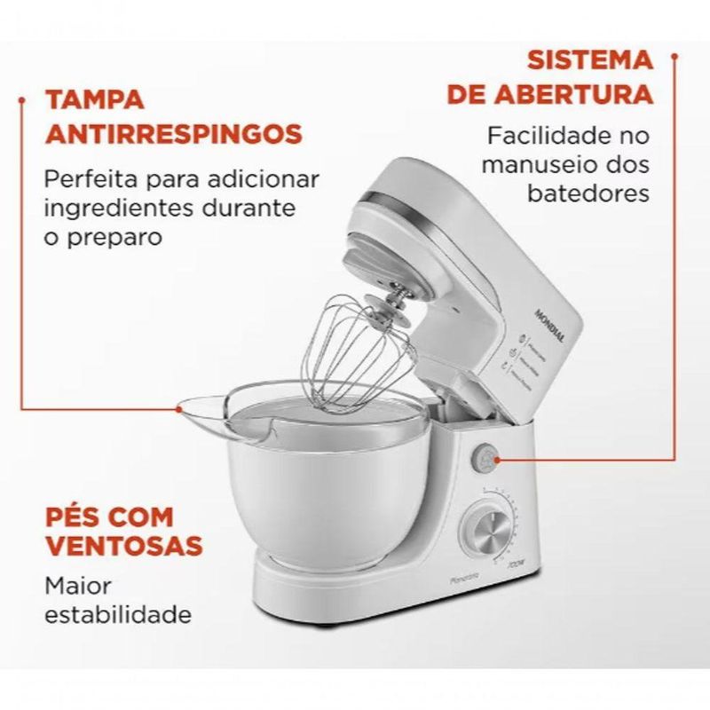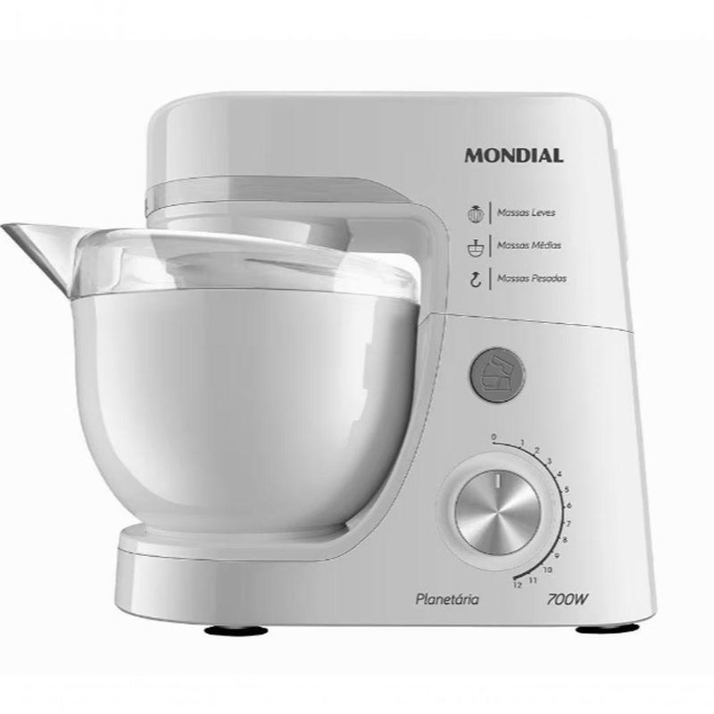 Batedeira Planetaria Mondial 700w Ultra Turbo Branca 127vA batedeira Mondial 700W Preta 127V possui suporte integrado e tigela que mantêm o produto fixo e facilitam o uso, pois não é necessário estar ciente de seu funcionamento. Economize tempo e ganhe resultados deliciosos. Ela também inclui 1 batedor em gancho, 1 batedor elíptico, 1 batedor plano, 1 tampa anti-respingos, 1 manual.Informações Técnicas:Marca MondialFrequência 60 HzPotência 700W / 127VTipo de batedeira Com pedestalQuantidade de velocidades 12Funções Amassar, Bater, MisturarCom função rotativa SimCapacidades das tigelas 4,5LQuantidade de tigelas 1Peso kgGarantia: 12 mesesAcessórios Inclusos 1 batedor em gancho, 1 batedor elíptico, 1 batedor plano, 1 tampa anti-respingos, 1 manual