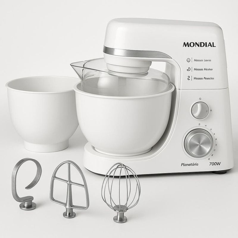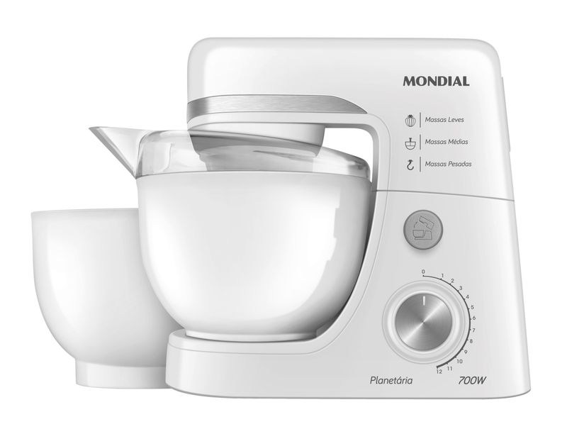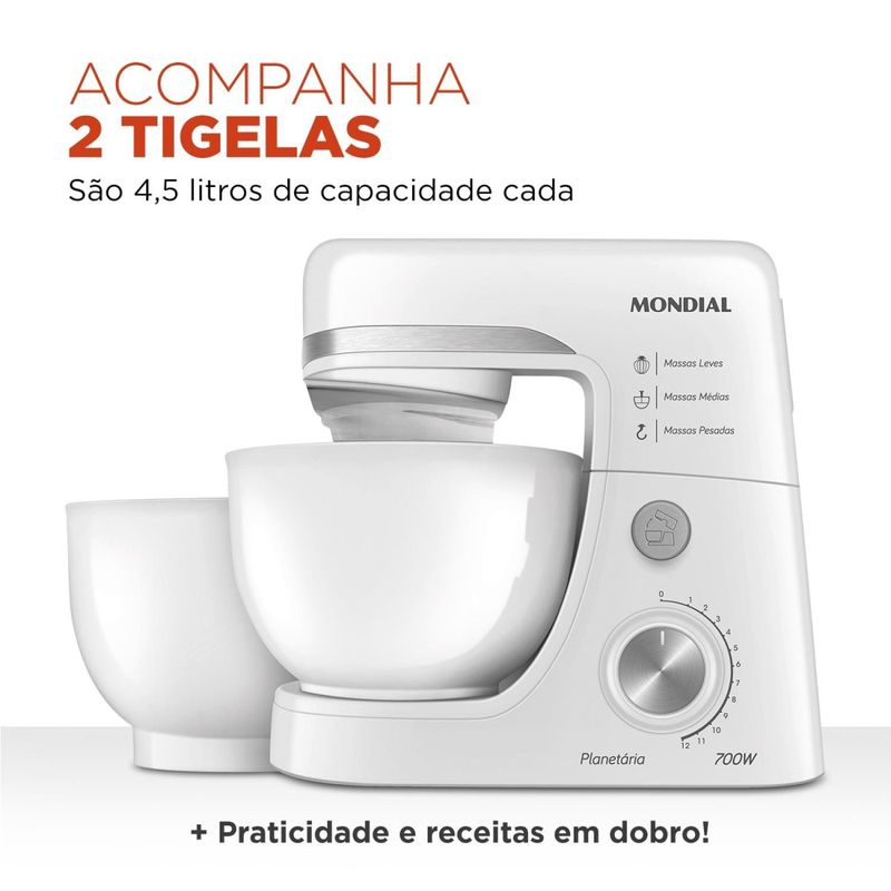 Descubra a potência e a elegância da Batedeira Planetária Mondial BP-03W-2B, perfeita para quem ama cozinhar com praticidade e alto desempenho. Com 700W de potência, ela é ideal para preparar desde bolos fofinhos até massas pesadas, como pães e pizzas.Seu sistema de batimento planetário mistura os ingredientes de forma homogênea e rápida, girando ao redor de si e da tigela ao mesmo tempo. Isso garante receitas mais bem preparadas e com textura perfeita.A Batedeira Mondial BP-03W-2B acompanha 3 tipos de batedores para massas leves, médias e pesadas, além de 12 velocidades que se adaptam a cada etapa do preparo. Versatilidade e controle total em suas mãos!Ela vem com duas tigelas de 4,5L, ideais para grandes receitas, e conta com sistema de abertura automática, facilitando o manuseio. A tampa antirrespingos permite adicionar ingredientes sem precisar desligar o aparelho, mantendo sua cozinha limpa e organizada.Charmosa, eficiente e robusta, essa batedeira é o toque que faltava na sua cozinha. Garanta já a sua Batedeira Planetária Mondial e prepare receitas incríveis com mais facilidade e estilo!