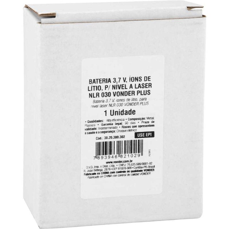 Cod. Fornecedor: 3820300302Marca: Vonder Conteúdo da embalagem: 1 Bateria.Destaques e diferenciais: Bateria de íons de lítio, garantindo alta eficiência de operação.Aplicações e dicas de uso: Indicada para reposição no nível a laser NLR 030 VONDER.Garantia legal: 90 diasQualificação TécnicaTipo de bateria: Íons de lítio Tensão (V): 3,7 V Capacidade da bateria (A): 5.200 mAh Massa aproximada (peso) (kg): 0,11 kg