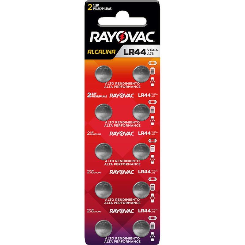 Bateria Alcalina, Lr44, 1,5 V, V13ga-5 Rayovac - Conteúdo da embalagem: 1 Cartela com 5 pares. Aplicação: Indicada para lanternas, brinquedos, equipamentos, entre outros. Não recarregável. Destaques: Alto rendimento, alta performance. Garantia - E (CDC): Garantia legal: 90 dias Referência: V13GA-5 Tipo da bateria: Alcalina Tensão da bateria (V): 1,5 V Massa aproximada (peso): 0,2 kg Destaques Comercial: Alto rendimento, alta performance. Aplicação Comercial: Indicada para lanternas, brinquedos, equipamentos, entre outros. Não recarregável. Características Gerais do Produto: Garantia: • 3 Meses