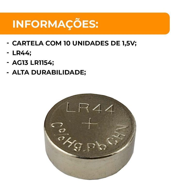 Bateria Lr44, Ag13, Lr1154 Elgin Pilha Alcalina Original - 3 CartelasBateria LR44, AG13, LR1154 Elgin Pilha Alcalina Original - 3 CartelasMarca: Elgin Código: 82194 Categoria: LR44, AG13, LR1154 Voltagem (volts): 1.5v - Alcalina - Blister com 10 unidades - Alta Durabilidade - Eficiência e praticidade - Excelente desempenho Indicadas para equipamentos que requerem descargas de energia rápidas e fortes, como brinquedos, câmeras fotográficas digitais, MP3 players, lanternas, as Pilhas e Baterias Elgin Energy apresentam ótima relação custo/benefício, garantindo alta durabilidade; Aprovadas pelo INMETRO colaboram para a preservação do meio ambiente, pois não apresentam metais pesados em sua composição com 0% de Cádmio e Mercúrio; As pilhas Elgin Energy são testadas periodicamente por laboratórios credenciados pelo INMETRO, para garantir a qualidade e conformidade com a resolução Conama 401; As Pilhas Elgin Energy tem 0% de Mercúrio e Cadmio em sua composição, colaborando para a preservação do meio ambiente; As pilhas Elgin Energy foram aprovadas em todos os quesitos e têm ótima relação custo/benefício. Economize e tenha pilhas de qualidade; A Elgin faz parte do programa Abinee recebe Pilhas, que conta com diversos pontos de coleta no Brasil e destina as pilhas para reciclagem de forma ambientalmente correta. A Elgin disponibiliza papa-pilhas e postos de coleta em assistências; Em testes realizados pelo INMETRO foram avaliadas 11 marcas de pilhas do mercado. O custo por hora útil das pilhas Elgin Energy apresentou excelentes resultados; **ATENÇÃO** - FAVOR CONFERIR A MERCADORIA ANTES DE DISPENSAR A TRANSPORTADORA! NÃO ACEITAREMOS RECLAMAÇÕES DEPOIS QUE A TRANSPORTADORA SAIR DO LOCAL.Características Gerais do Produto: - Fabricante: ELGIN - Modelo: LR44, AG13, LR1154Acompanha o produto: - Cartela Bateria Elgin com 10 unidades