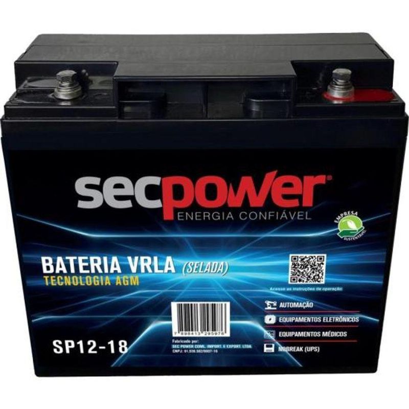 Bateria Selada 12V 18ah SP12-18 SecpowerA Bateria Selada 12V 18Ah SP12-18 da SecPower é uma fonte confiável de energia, projetada para oferecer desempenho duradouro e sem manutenção. Com uma vida útil de 3 a 5 anos, esta bateria chumbo-ácido VRLA AGM é ideal para uma variedade de aplicações, incluindo nobreaks (UPS), sistemas de alarme, segurança e iluminação de emergência. Desenvolvida com tecnologia avançada, esta bateria garante segurança e conformidade com as normas do mercado.Aplicações e usos principais:Sistemas de alarme contra incêndio, luz de emergência, sinalização, mini UPS. Brinquedos (moto e carrinhos elétricos com tração), equipamentos médicos de controle, de teste etc. Bicicleta scooter, patinete, skate, caixa registradora, computadores, TV.Aplicações e usos secundários:Veículos elétricos, golf car, máquinas lavadoras, cadeira de rodas, barcos, equipamentos marítimos.Voltagem:12VAmperagem:18AhDimensões:(A x L x C): 167 ±1 x 77 ±1 x 181 ±1 mmAltura total: 167 ±1 mmPesquisa:bateria|bateria selada|selada|bateria secpower|secpower|SP12-18|18ah|12v|bateria 12v|bateria para alarme|bateria alarme|SP12 18- Peso do produto: 5,0 kg ± 4% (aprox.)- Excelente custo/benefício- 12 meses de garantia- Maior autonomia- Menor índice de defeito do mercado, inferior a 0,03%- Totalmente livre de manutenção