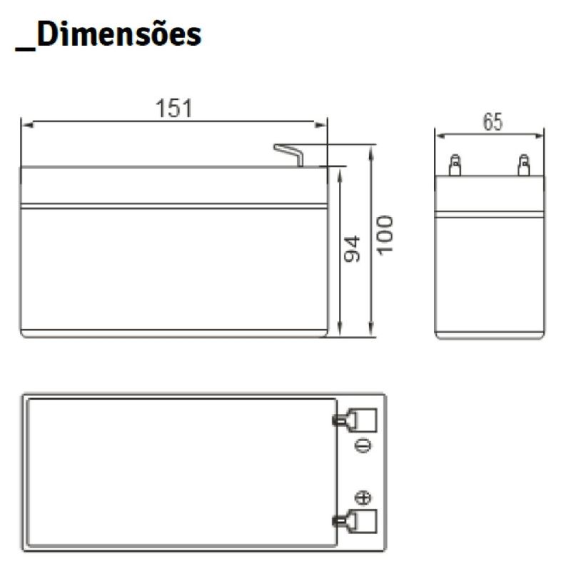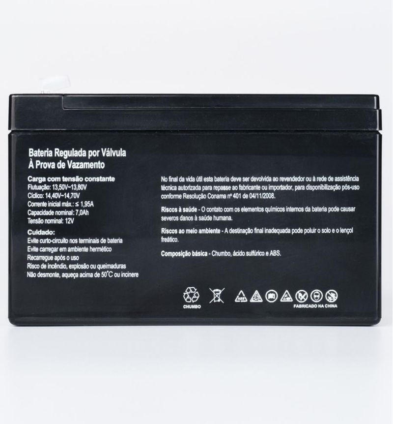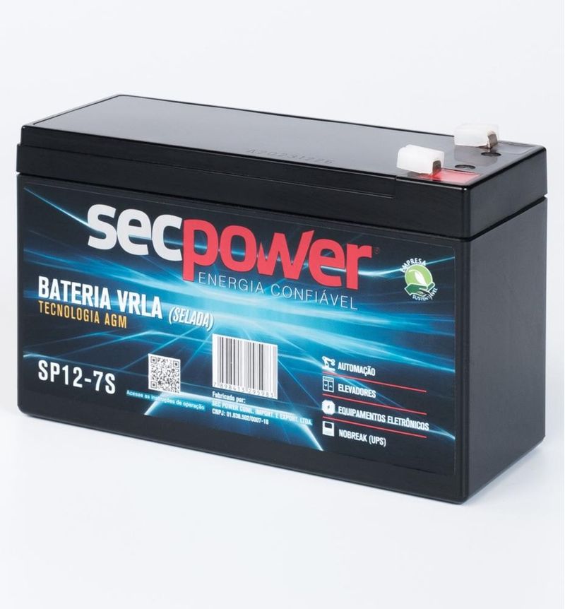 A Bateria SecPower SP12-7S e a solucao ideal para quem busca confiabilidade. Fabricada com tecnologia VRLA (regulada por valvula) e separadores AGM (eletronico absorvido), ela e livre de manutencao e possui alta eficiencia em diversos sistemas de energia.ESPECIFICACOES TECNICASTensao Nominal: 12 V.Capacidade Nominal (100h): 7,00 Ah.Capacidade (20h): 6,50 Ah.Vida Util Projetada: 05 anos a 25 graus Celsius.Corrente Maxima de Carga: 1,95 A.Maxima Corrente de Descarga: 105A (por 5 segundos).Resistencia Interna: Aprox. 32 mOhm (100% carregada).DIMENSOES E PESOComprimento: 151 mm (+/- 1mm).+1Largura: 65 mm (+/- 1mm).+1Altura: 94 mm (+/- 1mm).+1Altura Total: 100 mm (+/- 1mm).+1Peso Aproximado: 2kg.CONSTRUCAO E SEGURANCATerminal: Tipo Faston F1 em cobre.+2Material do Vaso: ABS de alta resistencia (UL94-HB).Seguranca: Projeto a prova de explosao reconhecido por UL e CE.Autodescarga: Baixa taxa, mantendo 91% da carga apos 3 meses.PARAMETROS DE CARGA (A 25 GRAUS CELSIUS)Tensao de Fluatacao: 13,50 a 13,80 V.Tensao Carga Ciclica: 14,40 a 14,70Principais utilizações: No-Breaks, Sistemas de Alarme, Iluminação de Emergência, Sistema de Telecom, Sistemas Médicos, Cerca Elétrica, Alarmes de Incêndio.Produzida com Chumbo de Alta Pureza.Terminais do Tipo Fast On (Engate Rápido)