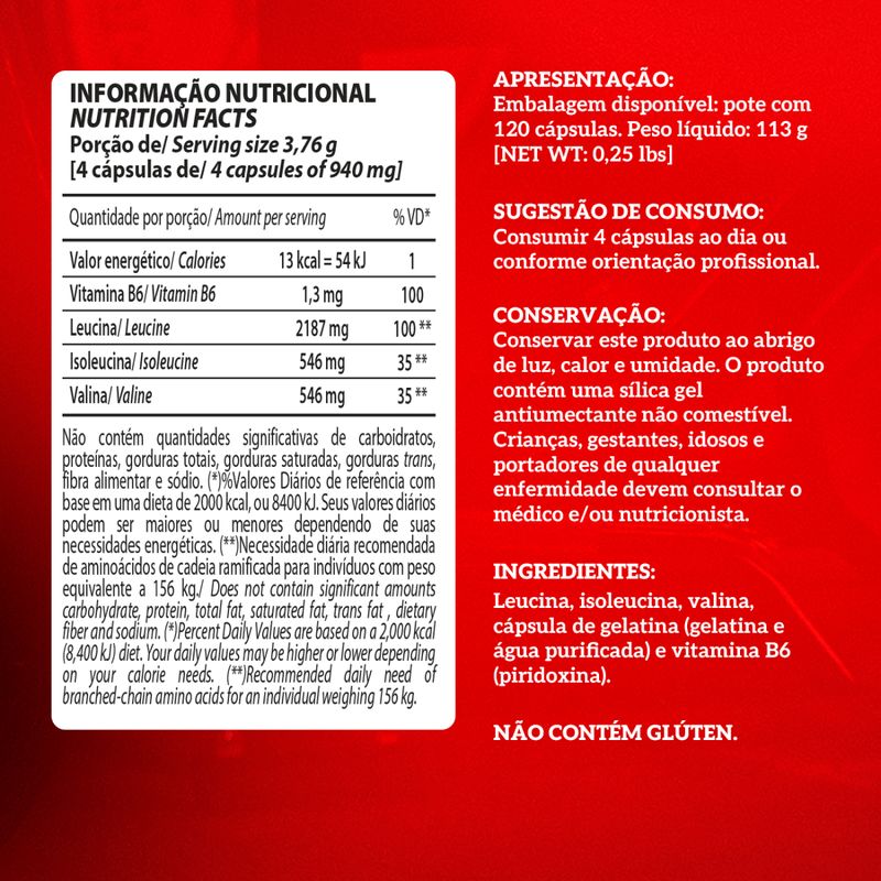 BCAA Top é a melhor opção para uma rápida recuperação muscular. Sua fórmula ultra concentrada garante aumento de energia e apoio na recuperação de micro-lesões. Um forte aliado no ganho de massa muscular, esse suplemento é composto pelos 3 aminoácidos essenciais: leucina, Isoleucina e valina. Também conta com a adição de vitamina B6, que melhora a absorção dos aminoácidos pelas células. Os aminoácidos são as estruturas que formam uma proteína, e podem ser classificados como aminoácidos essenciais, que como o próprio nome diz são essenciais para o corpo humano, precisando ser ingeridos pela dieta, e os aminoácidos não-essenciais, que nosso corpo já produz e não precisam ser ingeridos pela dieta. Os aminoácidos de cadeia ramificada, mais conhecidos como BCAA's (do termo em inglês branched- chain amino acids) são componentes fundamentais das estruturas musculares e fundamentais para quem pratica atividade física, fazendo parte do grupo de aminoácidos essenciais, uma vez que não são produzidos naturalmente por nosso organismo precisando assim ser ingeridos por meio da alimentação ou suplementação. O BCAA Top não possui nenhum aditivo na fórmula, sendo composto apenas por aminoácidos essenciais de altíssima qualidade. Tendo sua pureza comprovada através do selo PURE AMINO ACID by AJINOMOTO Co.®. O BCAA Top está disponível na opção pote com 120 cápsulas.