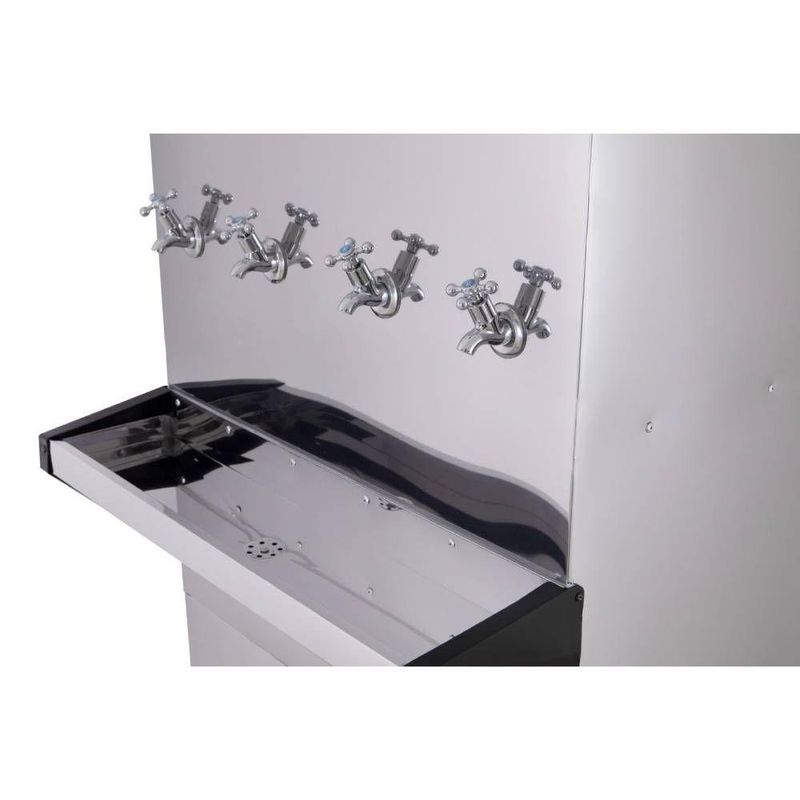Bebedouro Industrial Coluna Knox 200L Inox - Garanta água pura e gelada com eficiência para grandes ambientesO Bebedouro Industrial Coluna Knox 200L 4 Torneiras Geladas Inox oferece alta capacidade e resistência para atender grandes fluxos de pessoas com praticidade e segurança. Com estrutura e revestimento em aço inox 430, o equipamento garante durabilidade e fácil higienização, enquanto o reservatório interno em polipropileno atóxico mantém a qualidade da água.Seu sistema de refrigeração com serpentina em aço inox 304 e gás ecológico R134a proporciona eficiência no resfriamento, aliado ao termostato com 7 níveis de ajuste de temperatura, permitindo controlar a água conforme a necessidade.O modelo possui quatro torneiras de água gelada, além de filtro POU 5 classe C, que reduz impurezas e melhora o sabor da água. O aparador de água reforçado com laterais em ABS aumenta a segurança no uso e facilita a limpeza, enquanto os pés reguláveis garantem estabilidade em diferentes superfícies.Com capacidade de 200 litros e atendimento de até 600 pessoas por hora, o bebedouro Knox é ideal para ambientes corporativos, industriais e institucionais.Mais resistência, capacidade e pureza para o dia a dia de grandes espaços.Especificações Técnicas:Marca: KnoxModelo: KX20-D 4TVoltagem: 220VCor: InoxTipo: IndustrialInstalação: PisoCapacidade de refrigeração: 15,995 l/hCapacidade de armazenamento: 200 LNúmero de torneiras: 4Consumo aproximado de energia: 67,92 Kw / mêsFrequência: 60 HzMaterial do reservatório interno: Polipropileno atóxicoPossui filtro de água: Sim, POU 5 classe CTipo de pés/base: ABSMaterial do gabinete: Aço InoxPossui bandeja coletora: SimDimensões do produto: 164 A x 75 L x 77 P cmPeso: 45 kgGarantia: 12 meses