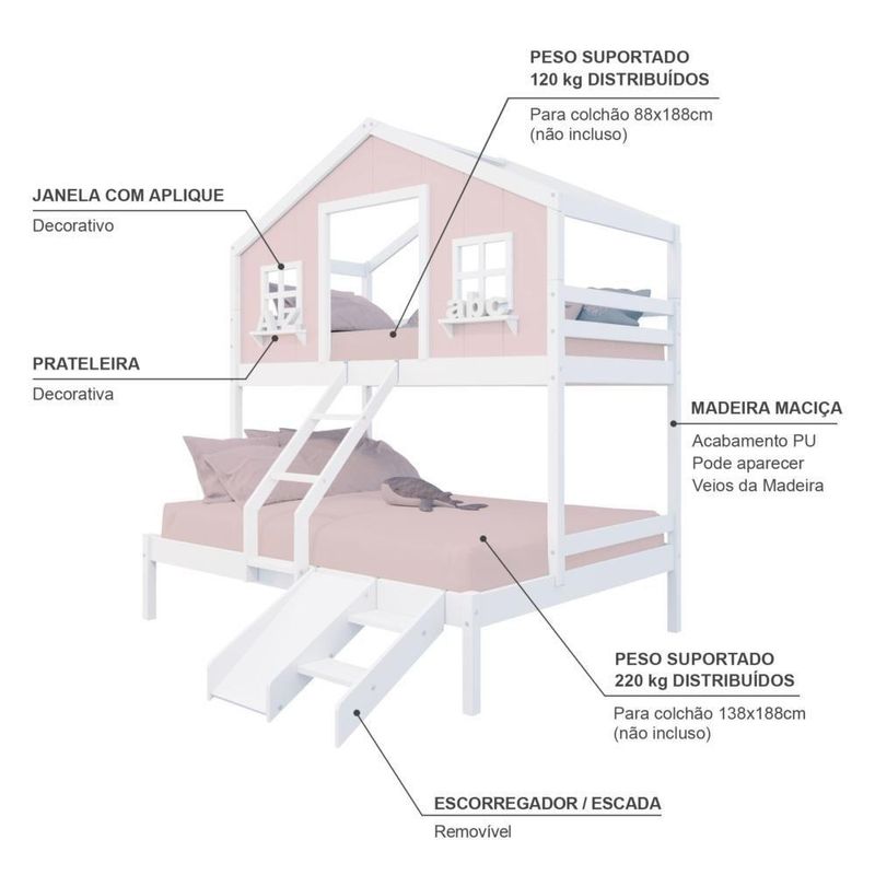 Beliche Casal/ Solteiro Casinha Dos Sonhos Com Kit Escada/ Escorregador Madeira Maciça Rosa/ Branco MegamobiliaDETALHESAcabamento: Rosa/ Branco PU (pode mostrar veios da madeira)Estrutura: Madeira Maciça de Pinus de ReflorestamentoMedidas dos Colchões da Cama de Solteiro (cm x cm): 88x188 (Não Incluso)Medidas dos Colchões da Cama de Casal (cm x cm): 138x188 (Não Incluso)Peso Cama de Solteiro Suportado: 120 KgPeso Cama de Casal Suportado: 220 KgDiferenciais: Escada com Leve Curvatura, Casinha com fechamento em MDF, Janela e Prateleira Decorativa, kit Escada/ Escorregador.DIMENSÕES DO BELICHE MONTADOAltura (cm): 227Largura (cm):199Profundidade (cm):146,7INFORMAÇÕES COMPLEMENTARESGarantia do Fabricante: Prazo de 3 meses por defeito de fabricaçãoNecessita de Montagem: SIM (Acompanha manual de montagem)Atenção: Não realizamos serviço de montagem e instalação. Imagens meramente ilustrativas. Cores e tonalidades podem variar.EMBALAGEMPeso (KG):74Quantidade de Volumes:05 Material Principal: Madeira Maciça | Cor Predominante: Rosa/ Branco | Necessita Montagem: Sim | Acompanha Colchão: Não | Tipo de Cama: Beliche | Altura: 227 | Largura: 146,7 | Comprimento: 199 | Peso: 74 | Peso máximo suportado: 120 e 220 | Cor Via: Rosa/ Branco | Peso com Embalagem: 74 | Comprimento com Embalagem: 192 | Largura com Embalagem: 30 | Altura com Embalagem: 30 | Tamanho da Cama: Beliche Casal/ Solteiro | Descrição do Tamanho: Beliche Casal/ Solteiro | Quantidade de Caixas: 05