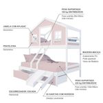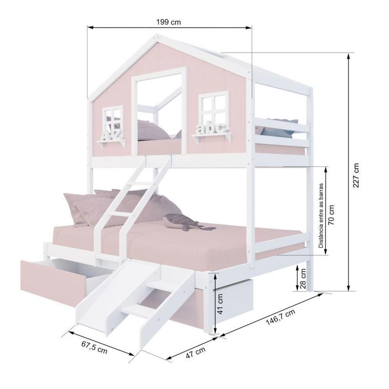 Beliche Casal/ Solteiro Casinha Sonhos 02 Gavetas Rosa Kit Escada/ Escorregador Madeira Maciça Rosa/ Branco HousinDETALHESAcabamento: Rosa/ Branco PU (pode mostrar veios da madeira)Estrutura: Madeira Maciça de Pinus de ReflorestamentoMedidas dos Colchões da Cama de Solteiro (cm x cm): 88x188 (Não Incluso)Medidas dos Colchões da Cama de Casal (cm x cm): 138x188 (Não Incluso)Peso Cama de Solteiro Suportado: 120 KgPeso Cama de Casal Suportado: 220 KgDiferenciais: Escada com Leve Curvatura, Casinha com fechamento em MDF, Janela e Prateleira Decorativa, 02 Gavetas com Rodízios, Kit Escada/ Escorregador.DIMENSÕES DO BELICHE MONTADOAltura (cm): 227Largura (cm):199Profundidade (cm):146,7INFORMAÇÕES COMPLEMENTARESGarantia do Fabricante: Prazo de 3 meses por defeito de fabricaçãoNecessita de Montagem: SIM (Acompanha manual de montagem)Atenção: Não realizamos serviço de montagem e instalação. Imagens meramente ilustrativas. Cores e tonalidades podem variar.EMBALAGEMPeso (KG):96,8Quantidade de Volumes:06Material Principal: Madeira | Cor: Branco | Rosa | Necessita Montagem: Sim | Acompanha Colchão: Não | Tipo de Cama: Beliche Casal | Solteiro