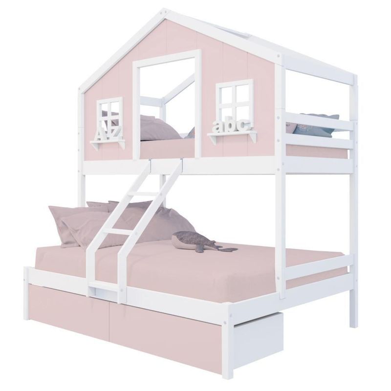 Beliche Casal/ Solteiro Casinha Sonhos Com 02 Gavetas Rosa Madeira Maciça Rosa/ Branco HousinDETALHESAcabamento: Rosa/ Branco PU (pode mostrar veios da madeira)Estrutura: Madeira Maciça de Pinus de ReflorestamentoMedidas dos Colchões da Cama de Solteiro (cm x cm): 88x188 (Não Incluso)Medidas dos Colchões da Cama de Casal (cm x cm): 138x188 (Não Incluso)Peso Cama de Solteiro Suportado: 120 KgPeso Cama de Casal Suportado: 220 KgDiferenciais: Escada com Leve Curvatura, Casinha com fechamento em MDF, Janela e Prateleira Decorativa, 02 Gavetas com Rodízios.DIMENSÕES DO BELICHE MONTADOAltura (cm): 227Largura (cm):199Profundidade (cm):146,7INFORMAÇÕES COMPLEMENTARESGarantia do Fabricante: Prazo de 3 meses por defeito de fabricaçãoNecessita de Montagem: SIM (Acompanha manual de montagem)Atenção: Não realizamos serviço de montagem e instalação. Imagens meramente ilustrativas. Cores e tonalidades podem variar.EMBALAGEMPeso (KG):91,3Quantidade de Volumes:05Material Principal: Madeira | Cor: Branco | Rosa | Necessita Montagem: Sim | Acompanha Colchão: Não | Tipo de Cama: Beliche Casal/Solteiro