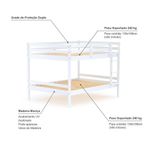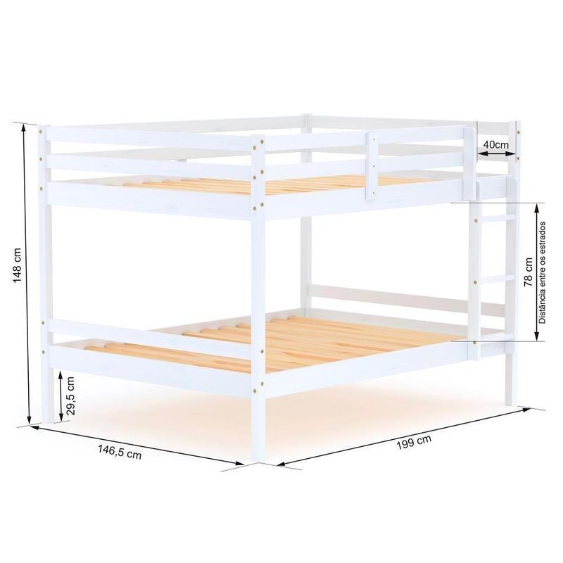 Beliche Casal Casal Eco Madeira Maciça Branco MobilistoreDETALHESAcabamento: Branco UV (pode mostrar veios da madeira)Estrutura: Madeira Maciça de Pinus de ReflorestamentoMedidas do Colchão da Cama de Casal (cm x cm): 188x138 (Não Incluso)Peso Suportado Cama de Casal: 240 KgDiferenciais: Todo em Madeira, Escada Fixa, Grade de Proteção Dupla.DIMENSÕES DO BELICHE MONTADOAltura (cm):148Largura (cm):199Profundidade (cm):146,5INFORMAÇÕES COMPLEMENTARESGarantia do Fabricante:Prazo de 3 meses por defeito de fabricaçãoNecessita de Montagem:SIM (Acompanha manual de montagem)Atenção:Não realizamos serviço de montagem e instalação. Imagens meramente ilustrativas. Cores e tonalidades podem variar.EMBALAGEMPeso (KG):59Quantidade de Volumes:02 Material Principal: Madeira Maciça | Cor Predominante: Branco | Necessita Montagem: Sim | Acompanha Colchão: Não | Tipo de Cama: Beliche | Cor: Branco