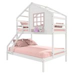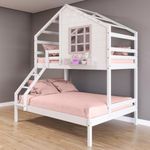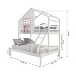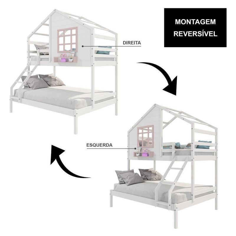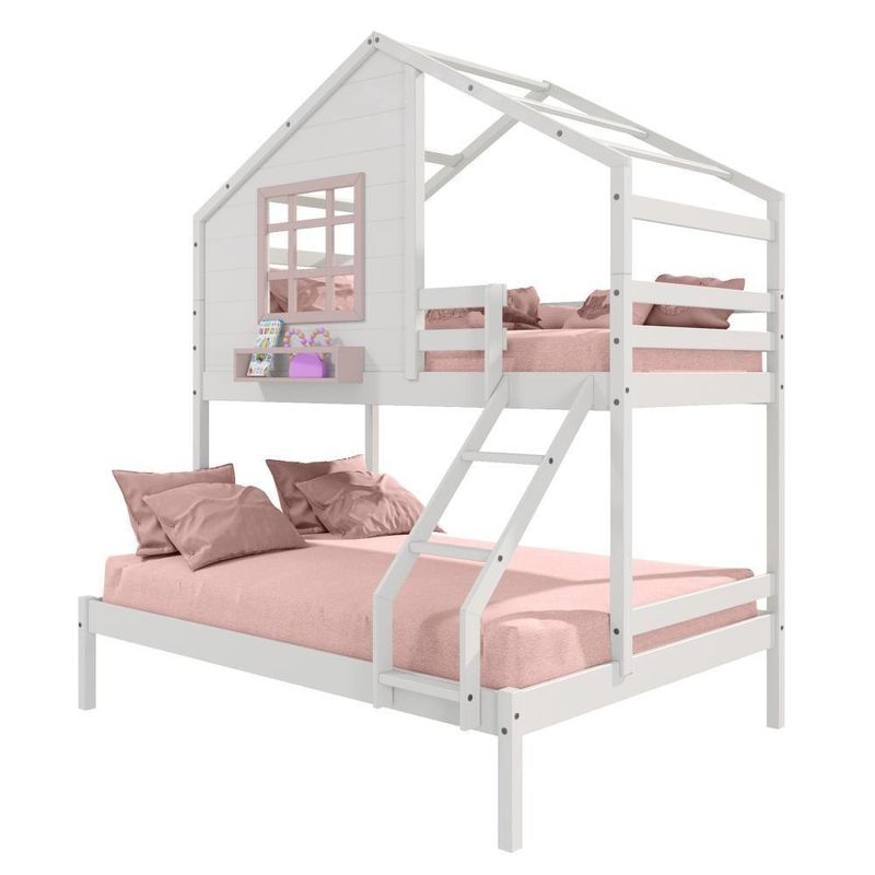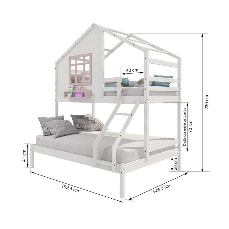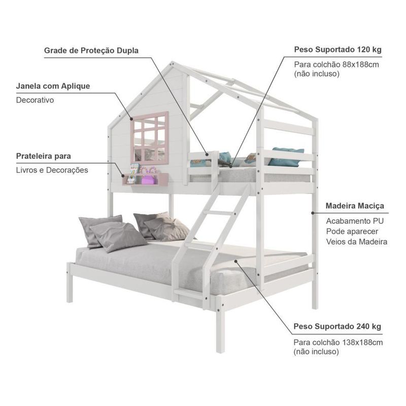 Beliche Casinha Com Janela Casal/solteiro Madeira Maciça Branco/ Rosa HousinDETALHESAcabamento: Branco/ Rosa PU (pode mostrar veios da madeira)Estrutura: Madeira Maciça de Pinus de ReflorestamentoMedidas dos Colchões da Cama de Solteiro (cm x cm): 88x188 (Não Incluso)Medidas dos Colchões da Cama de Casal (cm x cm): 138x188 (Não Incluso)Peso Suportado Cama de Solteiro: 120 KgPeso Suportado Cama de Casal: 240 KgDiferenciais: Escada com Leve Curvatura, Casinha com fechamento em MDF, Janela e Prateleira para Livros e Decoração, Montagem Reversível (Lado Direito ou Lado Esquerdo)DIMENSÕES DO BELICHE MONTADOAltura (cm):230Largura (cm):199,4Profundidade (cm):146,7INFORMAÇÕES COMPLEMENTARESGarantia do Fabricante: Prazo de 3 meses por defeito de fabricaçãoNecessita de Montagem: SIM (Acompanha manual de montagem)Atenção: Não realizamos serviço de montagem e instalação. Imagens meramente ilustrativas. Cores e tonalidades podem variar.EMBALAGEMPeso (KG):73Quantidade de Volumes:03Material Principal: Madeira Maciça | Cor: Branco | Necessita Montagem: Sim | Acompanha Colchão: Não | Tipo de Cama: Beliche