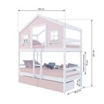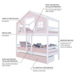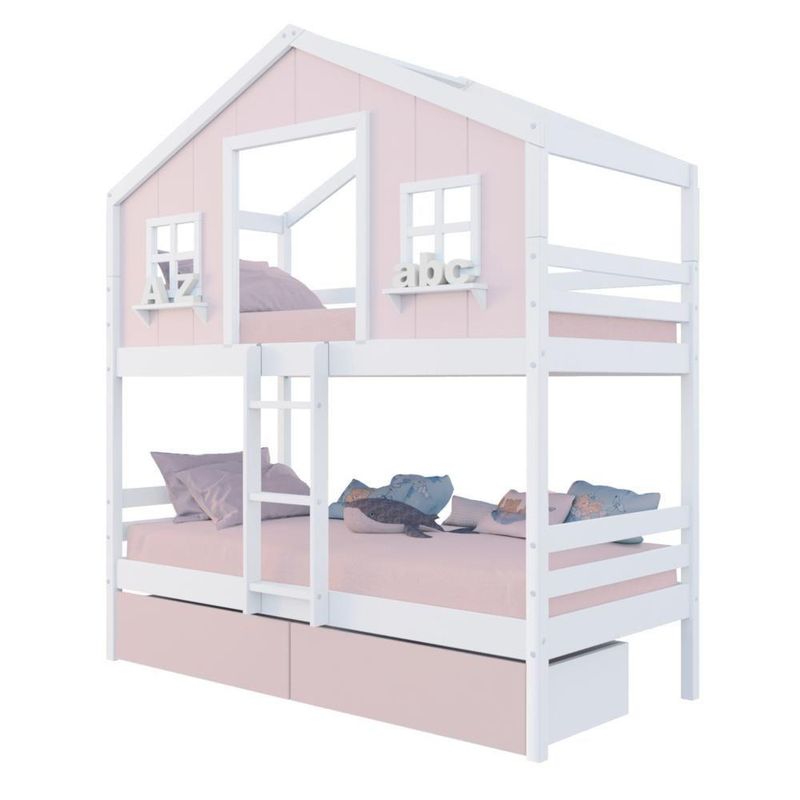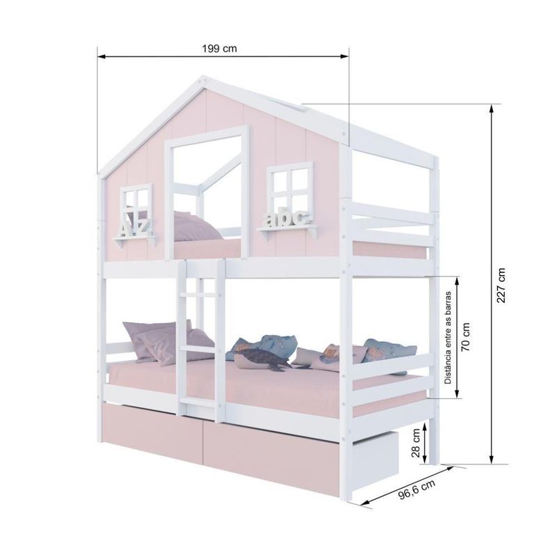 Beliche Casinha Dos Sonhos Com 02 Gavetas Rosa Madeira Maciça Rosa/ Branco HousinDETALHESAcabamento: Rosa/ Branco PU (pode mostrar veios da madeira)Estrutura: Madeira Maciça de Pinus de ReflorestamentoMedidas dos Colchões da Cama de Solteiro (cm x cm): 88x188 (Não Incluso)Peso Suportado Cama de Solteiro: 120 KgDiferenciais: Escada Fixa, Casinha com fechamento em MDF, Janela e Prateleira Decorativa, 02 Gavetas com Rodízios.DIMENSÕES DO BELICHE MONTADOAltura (cm):227Largura (cm):199Profundidade (cm):96,6INFORMAÇÕES COMPLEMENTARESGarantia do Fabricante: Prazo de 3 meses por defeito de fabricaçãoNecessita de Montagem: SIM (Acompanha manual de montagem)Atenção: Não realizamos serviço de montagem e instalação. Imagens meramente ilustrativas. Cores e tonalidades podem variar.EMBALAGEMPeso (KG): 87,1Quantidade de Volumes: 05Material Principal: Madeira | Cor: Branco/Rosa | Necessita Montagem: Sim | Acompanha Colchão: Não | Tipo de Cama: Beliche Solteiro