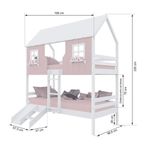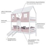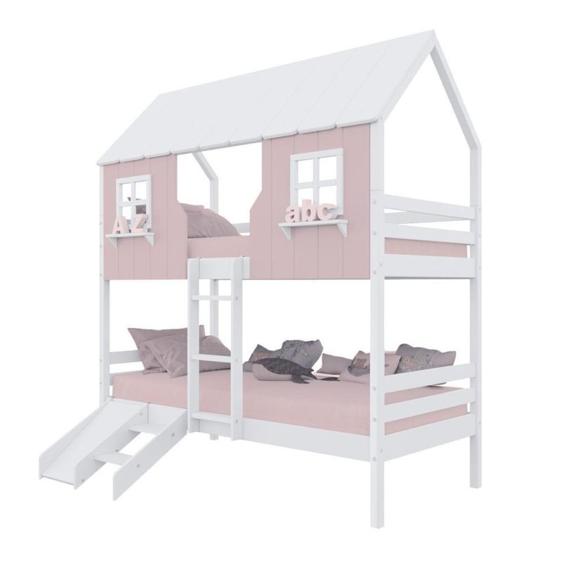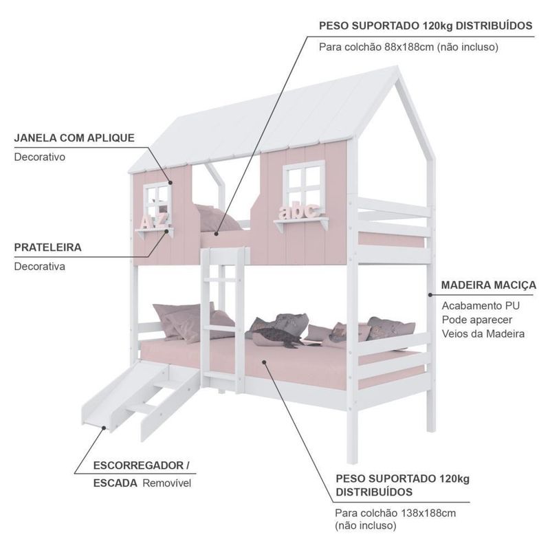 Beliche Casinha Encantada Com Kit Escada/ Escorregador Madeira Maciça Rosa/ Branco MegamobiliaDETALHESAcabamento: Rosa/ Branco PU (pode mostrar veios da madeira)Estrutura: Madeira Maciça de Pinus de ReflorestamentoMedidas dos Colchões da Cama (cm x cm): 88x188 (Não Incluso)Peso Suportado Cama: 120 KgDiferenciais: Escada Fixa, Casinha e Telhado com fechamento em MDF, Janela e Prateleira Decorativa, Kit Escada/ Escorregador.DIMENSÕES DO BELICHE MONTADOAltura (cm): 230Largura (cm): 199Profundidade (cm): 96,6INFORMAÇÕES COMPLEMENTARESGarantia do Fabricante: Prazo de 3 meses por de fabricaçãoNecessita de Montagem: SIM (Acompanha manual de montagem)Atenção: Não realizamos serviço de montagem e instalação. Imagens meramente ilustrativas. Cores e tonalidades podem variar.EMBALAGEMPeso (KG): 83,5Quantidade de Volumes: 05 Material Principal: Madeira Maciça | Cor Predominante: Rosa/ Branco | Necessita Montagem: Sim | Acompanha Colchão: Não | Tipo de Cama: Beliche Solteiro | Altura: 230 | Largura: 96,6 | Comprimento: 199 | Peso: 83 | Peso máximo suportado: 120 | Cor Via: Rosa/ Branco | Peso com Embalagem: 83 | Comprimento com Embalagem: 192 | Largura com Embalagem: 30 | Altura com Embalagem: 30 | Tamanho da Cama: Beliche Solteiro | Descrição do Tamanho: Beliche Solteiro | Quantidade de Caixas: 05