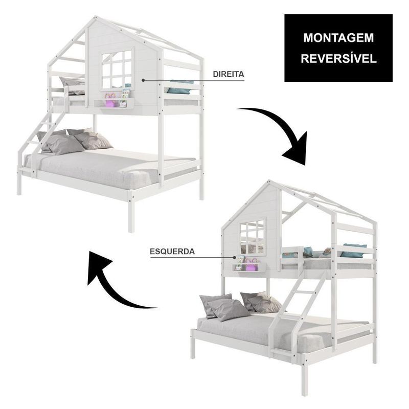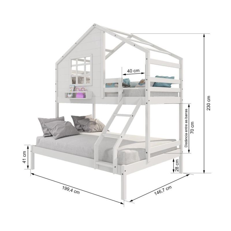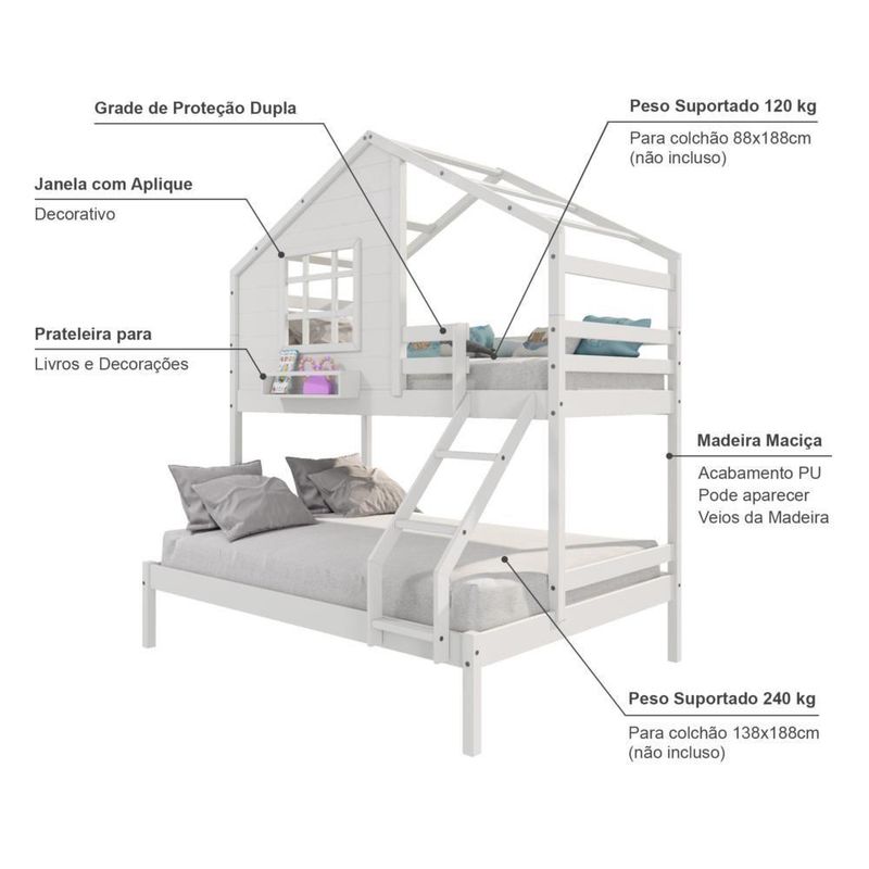 Beliche Casinha Com Janela Casal/Solteiro Madeira Maciça Branco HousinDETALHESAcabamento: Branco PU (pode mostrar veios da madeira)Estrutura: Madeira Maciça de Pinus de ReflorestamentoMedidas dos Colchões da Cama de Solteiro (cm x cm): 88x188 (Não Incluso)Medidas dos Colchões da Cama de Casal (cm x cm): 138x188 (Não Incluso)Peso Suportado Cama de Solteiro: 120 KgPeso Suportado Cama de Casal: 240 KgDiferenciais: Escada com Leve Curvatura, Casinha com fechamento em MDF, Janela e Prateleira para Livros e DecoraçãoDIMENSÕES DO BELICHE MONTADOAltura (cm):230Largura (cm):199,4Profundidade (cm):146,7INFORMAÇÕES COMPLEMENTARESGarantia do Fabricante: Prazo de 3 meses por defeito de fabricaçãoNecessita de Montagem: SIM (Acompanha manual de montagem)Atenção: Não realizamos serviço de montagem e instalação. Imagens meramente ilustrativas. Cores e tonalidades podem variar.EMBALAGEMPeso (KG):73Quantidade de Volumes:03 Material Principal: Madeira Maciça | Cor: Branco | Necessita Montagem: Sim | Acompanha Colchão: Não | Tipo de Cama: Beliche