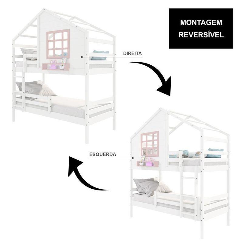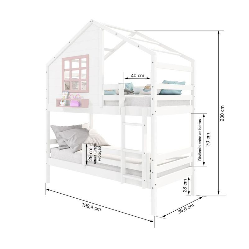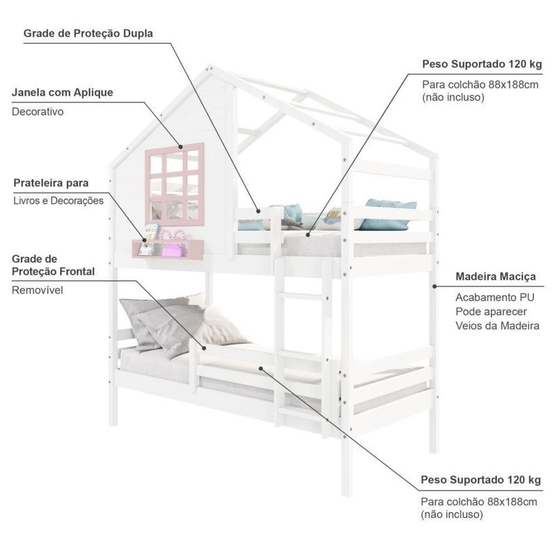 Beliche Casinha Com Janela E Grade De Proteção Madeira Maciça Branco/ Rosa HousinDETALHESAcabamento: Branco/ Rosa PU (pode mostrar veios da madeira)Estrutura: Madeira Maciça de Pinus de ReflorestamentoMedidas dos Colchões da Cama de Solteiro (cm x cm): 88x188 (Não Incluso)Peso Suportado Cama de Solteiro: 120 KgDiferenciais: Escada Fixa, Grade de Proteção Removivel, Casinha com fechamento em MDF, Janela e Prateleira para Livros e Decoração, Montagem Reversível (Lado Direito ou Lado Esquerdo)DIMENSÕES DO BELICHE MONTADOAltura (cm):230Largura (cm):199,4Profundidade (cm):96,6INFORMAÇÕES COMPLEMENTARESGarantia do Fabricante: Prazo de 3 meses por defeito de fabricaçãoNecessita de Montagem: SIM (Acompanha manual de montagem)Atenção: Não realizamos serviço de montagem e instalação. Imagens meramente ilustrativas. Cores e tonalidades podem variar.EMBALAGEMPeso (KG):69Quantidade de Volumes:04Material Principal: Madeira Maciça | Cor: Branco | Necessita Montagem: Sim | Acompanha Colchão: Não | Tipo de Cama: Beliche
