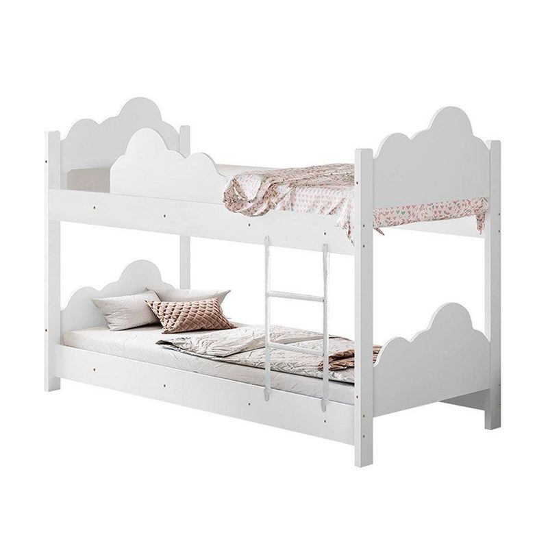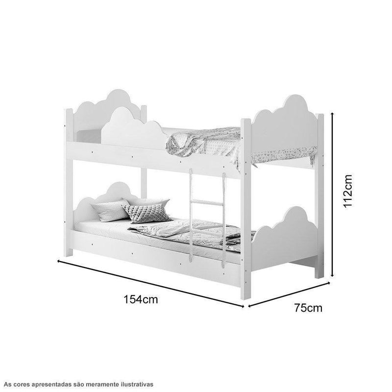 Beliche Infantil Marina Branco - DivalotoDimensões do Produto Montado:Altura: 112 cmLargura: 75 cmProfundidade: 154 cmObservações:- Design vazado em formato de nuvem- Material 100% mdf- Pintura UV verniz brilhante- Recomendado para colchão de 68x148cm (não acompanha colchão)- Não acompanha as arandelas- Escorregador não inclusoInformações adicionais:- Verifique o tamanho e os detalhes do produto antes de realizar a compra.- As fotos são meramente ilustrativas. Objetos decorativos que aparecem nas imagens não acompanham o produto.- A transportadora entregará o produto no portão e/ou portaria da residência, ou ainda, somente no andar térreo, em caso de prédios, do de .- Avaliar a mercadoria no ato do e recusar em caso de divergência ou . Color: Branco | Height: 112 | Width: 75 | Length: 154 | Altura do Produto com Embalagem (cm): 112 | Comprimento Produto com Embalagem (cm): 154 | Largura Produto com Embalagem (cm): 75 | Descrição do Tamanho: Infantil | Material para Filtro: MDF | Peso Produto Com Embalagem (Kg): | Produto: Beliche | Tonalidade (Leroy): Branco | Tipo de Cama/Cabeceira: Padrão | Classificação da Cama/Cabeceira: Infantil | Acompanha Colchão: Sem Colchão | Num. Volumes: 1 | Fabricante: Divaloto | Weight: | Modelo: Marina | REQUIRES_ASSEMBLY: Sim | MAX_WEIGHT_SUPPORTED_BY_BED: 70 | Modelo de Cama: Beliche