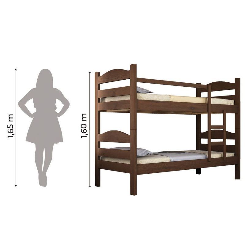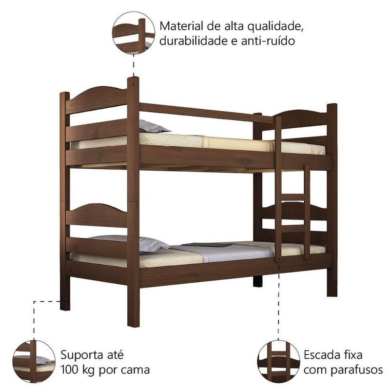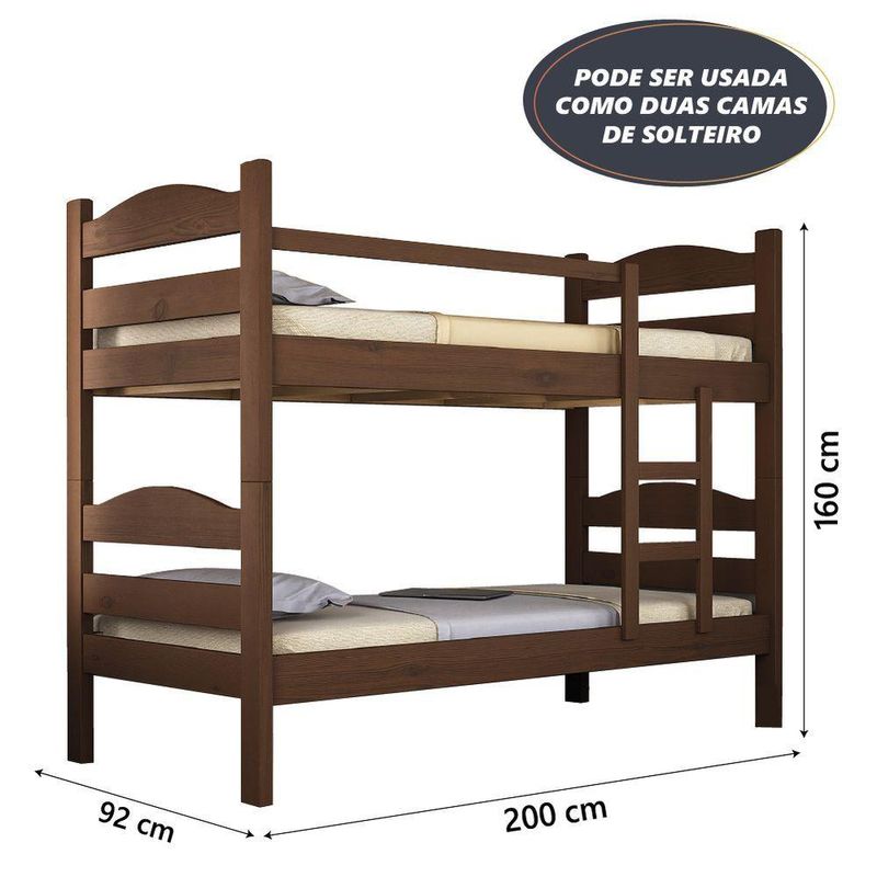Beliche Madeira Maciça Rubi Pederpinus Imbuia ImbuiaA Beliche Rubi oferece qualidade, segurança e versatilidade. Produzida em madeira Pinus maciça tratada, garante durabilidade e um acabamento refinado com pintura acetinada. Conta com travas opcionais para maior segurança na cama superior e uma escada prática para facilitar o acesso. Além disso, pode ser utilizada como beliche ou transformada em duas camas de solteiro, adaptando-se perfeitamente às suas necessidades de espaço e funcionalidade.MEDIDAS:[ A ] = 160 cm[ L ] = 92 cm[ P ] = 200 cmPESO: 45kgPESO SUPORTADO POR CAMA: 100 kgCaracterísticasMODELO: Beliche Madeira Maciça RubiMARCA: PederpinusCOR: ImbuiaACABAMENTO: AcetinadoMATERIAL: PinusSISTEMA DE MONTAGEM: ParafusosTAMANHO: Para colchões de solteiro: 0,88m (Solteiro)GARANTIA: 3 MesesDIFERENCIAL: Escada pode ser montada de ambos os lados, camas separadas.A Esplanada Móveis se responsabiliza pela entrega dos produtos adquiridos até a porta de entrada ou portaria do endereço indicado, se a portaria do condomínio permitir, as entregas são efetuadas no piso térreo e é de responsabilidade do cliente a locomoção da mercadoria até seu apartamento ou casa.Confira as dimensões do produto e certifique-se de que estão adequadas aos elevadores, portas e corredores do local da entrega. Não fazemos a montagem, desmontagem do produto e/ou portas e janelas, transporte pela escada ou içamento pelo lado de fora do prédio. Não está incluso no serviço de entrega o deslocamento até o interior do apartamento, com ou sem elevador, ou deslocamento em locais de difícil acesso como escadarias.Caso o cliente necessite de entrega dentro das dificuldades mencionadas, deverá entrar em contato para análise e cotação do valor do serviço.Certifique-se de tudo antes de finalizar a compra, evitando assim futuros desagrados ou imprevistos com a entrega. MEDIDAS:: [ A ] = 160 cm [ L ] = 92 cm [ P ] = 200 cm | PESO:: 45kg | PESO SUPORTADO POR CAMA:: 100 kg | MARCA:: Pederpinus | MATERIAL:: Pinus | SISTEMA DE MONTAGEM:: Parafusos | TAMANHO:: Para colchões de solteiro: 0,88m (Solteiro) | MODELO:: Beliche Rubi | COR:: Imbuia | ACABAMENTO:: Acetinado | GARANTIA:: 3 Meses | ALTURA: 160 cm | LARGURA: 92 cm | PROFUNDIDADE: 200 cm | TIPO DE CAMA: Beliche | TAMANHO DA CAMA: Solteiro | REQUER MONTAGEM: Sim Cor: Imbuia