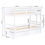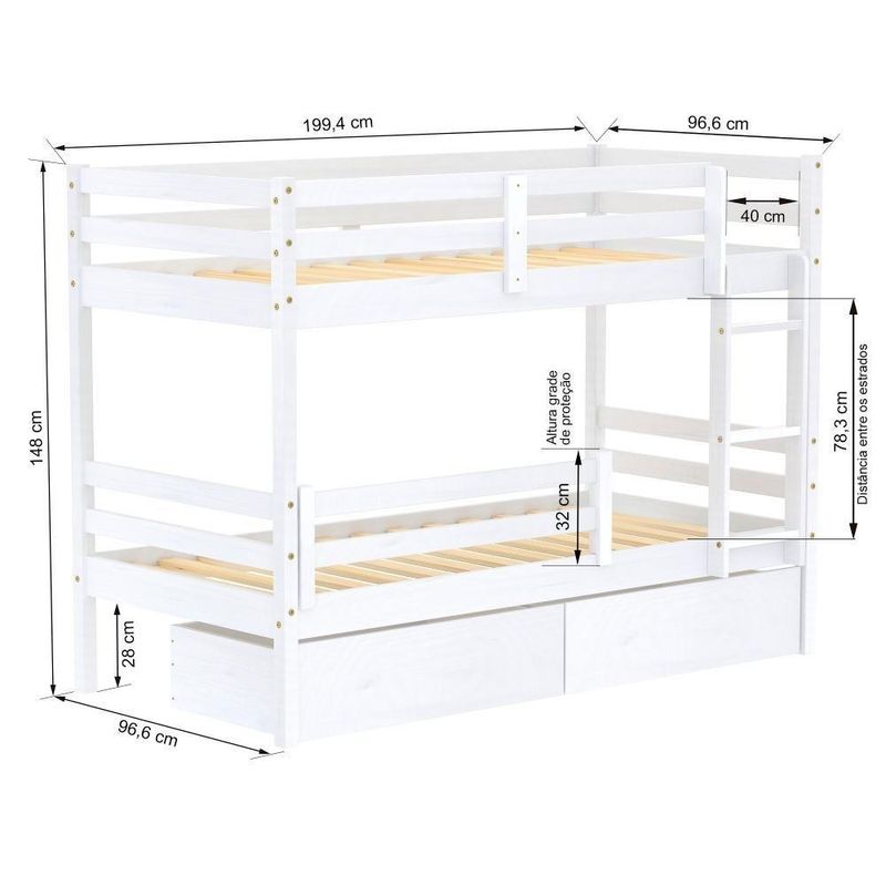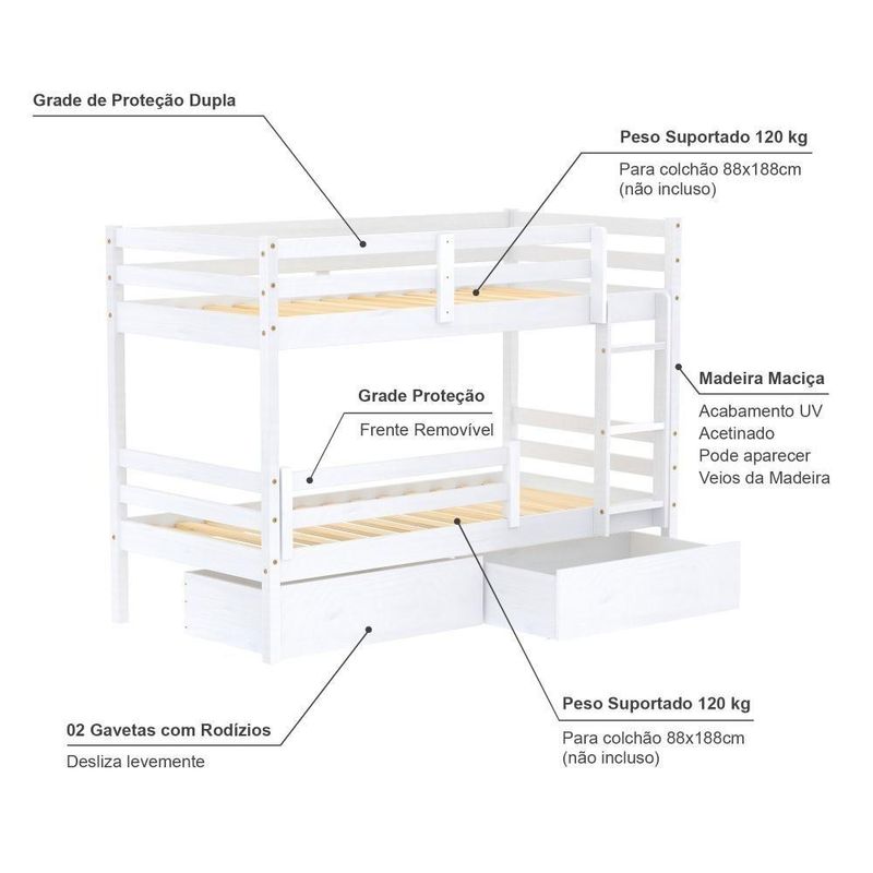 Beliche Solteiro Dreams Com 02 Gavetas E Grade De Proteção Madeira Maciça Branco MegamobiliaDETALHESAcabamento: Branco UV (pode mostrar veios da madeira)Estrutura: Madeira Maciça de Pinus de ReflorestamentoMedidas dos Colchões da Cama de Solteiro (cm x cm): 188x88 (Não Incluso)Peso Suportado Cama de Solteiro: 120 KgDiferenciais: Todo em Madeira, Escada Fixa, Grade de Proteção Dupla, Grade Removível, 02 Gavetas.DIMENSÕES DO BELICHE MONTADOAltura (cm):148Largura (cm):199,4Profundidade (cm):96,6INFORMAÇÕES COMPLEMENTARESGarantia do Fabricante: Prazo de 3 meses por defeito de fabricaçãoNecessita de Montagem: SIM (Acompanha manual de montagem)Atenção: Não realizamos serviço de montagem e instalação. Imagens meramente ilustrativas. Cores e tonalidades podem variar.EMBALAGEMPeso (KG):67Quantidade de Volumes:04 Material Principal: Madeira | Cor Predominante: Branco | Necessita Montagem: Sim | Acompanha Colchão: Não | Tipo de Cama: Beliche | Altura: 148 | Largura: 199,4 | Comprimento: 96,6 | Peso: 67 | Peso máximo suportado: 120 | Cor Via: Branco | Altura com Embalagem: 199,4 | Largura com Embalagem: 96,6 | Comprimento com Embalagem: 96,6 | Peso com Embalagem: 67 | Descrição do Tamanho: 199,4 x 96,6 x 96,6 | Tamanho da Cama: 88