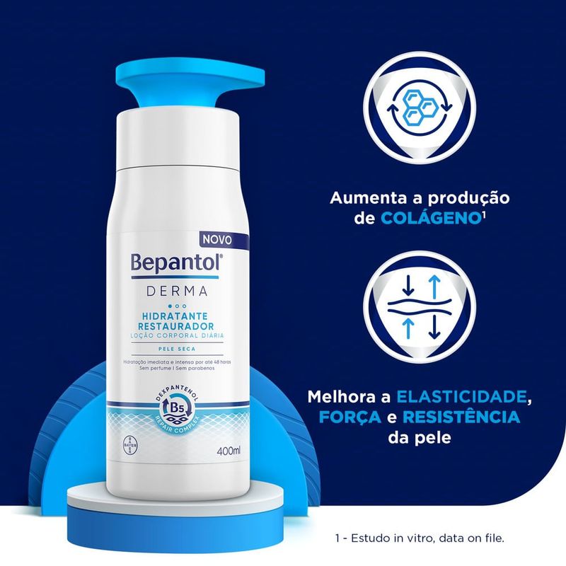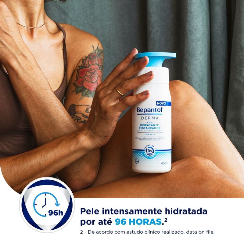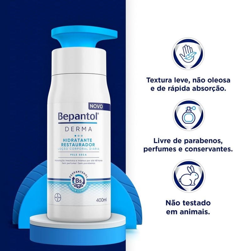 Bepantol Derma Lo??o Corporal Hidratante Restaurador 400ml Bepantol Derma Loção Corporal Hidratante Restaurador age na pele dentro para fora proporcionando uma hidratação intensa e duradora da pele por até 48 horas deixando-a macia e suave. Sua formulação conta com Dexpantenol Rapair Complex que possui componentes nutritivos que auxiliam na restauração da pele e Vitamina B3 que ajuda acalmar a pele seca. O Bepantol Derma Loção Corporal Hidratante Restaurador previne a recorrência da irritação e do ressecamento intenso além de entrega alivio imediato e prolongado do ressecamento. Esse produto é ideal para pele seca e recomendado para diabéticos. Livre de fragrância e conservantes. Dermatologicamente testado.