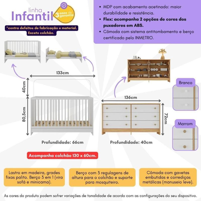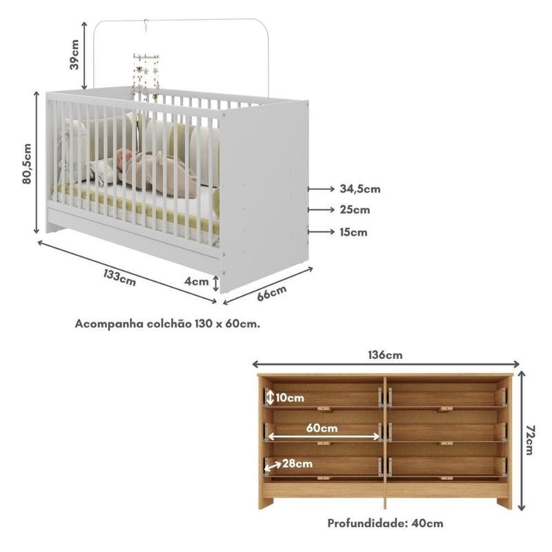 Berço 3 Em 1 Com Colchão Incluso E Cômoda Framboesa Multimóveis MP4680 Branco/madeiradoO Berço 3 em 1 com Colchão Incluso e Cômoda Framboesa Multimóveis MP4680 é a solução perfeita para os pais que buscam funcionalidade, segurança e estilo no quarto do bebê. Versátil, o berço se transforma facilmente em minicama e sofá, acompanhando o crescimento da criança e garantindo momentos de diversão.Versatilidade e durabilidade:O conjunto é produzido em MDP (12/15mm) com acabamento acetinado (cerca de 20% de brilho), combinando beleza e resistência. Para tornar as noites de sono do pequeno tranquilas, o berço suporta até 35kg (50kg como minicama ou sofá). Para um sono saudável, acompanha colchão D18 com tratamento antiácaro, antialérgico e impermeável em um dos lados.Proteção e segurança:Seu bebê merece o melhor! As grades fixas do berço no formato palito são produzidas em madeira maciça revestida. Para acompanhar todas as fases do bebê, o lastro em madeira conta com 3 regulagens de altura. O sistema antitombamento da cômoda garante a máxima segurança dia e noite, enquanto o suporte para mosquiteiro do berço deixará o seu filho protegido contra insetos indesejados.Organização e estilo:A cômoda conta com 6 gavetas, que suportam até 3kg em cada, e corrediças metálicas, oferecendo suavidade no manuseio e bastante espaço para acomodar as roupinhas e acessórios. Suportando até 17kg, o seu tampo permite embelezar o quarto com itens decorativos, como abajur e brinquedinhos.Conteúdo da Embalagem:1 (um) Berço 3 em 11 (um) Colchão1 (uma) CômodaManual de MontagemKit FerragemEspecificações Técnicas:Dimensões do Berço - Altura: 80,5cm | Largura: 133cm | Profundidade: 66cmDimensões do Colchão - Altura: 10cm | Largura: 130cm | Profundidade: 60cmDimensões da Cômoda - Altura: 72cm | Largura: 136cm | Profundidade: 40cmRegulagem de altura: 3 níveisSuporte para mosquiteiro: SimColchão incluso: Sim, tamanho 130 x 60cmCertificação INMETRO: Selo n°000332/2025*Você pode consultar as medidas detalhadas na imagem técnica do produto.*As cores dos produtos podem sofrer variações de tonalidade de acordo com as configurações do seu dispositivo.*Obrigatório fixar a cômoda na parede.Aqui na Loja Multimóveis, você pode concluir sua compra facilmente com toda segurança. A entrega é garantida e aqui você está em 1° lugar.Imagem meramente ilustrativa. Decoração não acompanha os produtos.Os produtos serão entregues desmontados e não disponibilizamos o serviço de montagem. Acabamento: Finish Foil | Tonalidade: Branco | Material: MDP | Referência do Modelo: MP4680 | Coleção: Framboesa | Instruções de Cuidado: Limpar com pano seco para retirar o pó. Não utilizar produtos químicos ou abrasivos a limpeza. Não aplicar lustra móveis. | Peso Suportado: 35 kg | Produto Composto Por: 1 berço, 1 colchão, 1 cômoda, manual de montagem e kit ferragem. | Sistema de Montagem: O produto acompanha manual de montagem juntamente com kit ferragem. O produto será entregue desmontado e não disponibilizamos o serviço de montagem. | Altura Montado: 80.5 | Largura Montado: 133 | Profundidade Montado: 66 | Tamanho (L x A x P): 133 x 80,5 x 66 | Peso do Produto: 62 | Acompanha Colchão: Sim | Vira Cama: Sim | Tamanho Colchão: 60 x 130 cm | Com gaveteiro: Sim | Idade Mínima: 0 anos | Idade Máxima: 3 anos | Possui Rodízio: Não | Portátil: Não | RBN: 17352336011 | Requer Montagem: Sim | Fabricante: Multimóveis | Garantia do Fabricante: 3 | Registro INMETRO: 000332/2025 | Altura (cm): 80,5 cm | Largura (cm): 133 cm | Profundidade (cm): 66 cm | Tipos de Madeira: MDP | Regulamentado pelo INMETRO: Sim | Tempo de Garantia: 3 meses | Tipo de Berço: Funcional | Quantidade de posições: 3 | Com muda-fraldas: Não | Com função co-sleeping: Não | Com grade removível: Sim | Peso (kg): 62 kg | Destaque 1: Produzido em MDP: maior durabilidade e resistência. | Destaque 2: Berço 3 em 1: se transforma em minicama e sofá. | Destaque 3: Acompanha suporte para mosquiteiro. | Destaque 4: Cômoda com 6 gavetas e corrediças metálicas: amplo espaço interno e leveza no manuseio. | Destaque 5: Tamanho do berço montado (L x A x P): 133 x 80,5 x 66 cm | Idade recomendada: 0-24 meses | Marca: Multimóveis | Quantidade de caixas de embalagem: 03 | Baterias são necessárias?: Não | Certificação de teste externa: 000332/2025 | Is Fragile: Não | Dimensões do item P x L x A: length#value=66;length#unit=centimeters;width#value=133;width#unit=centimeters;height#value=80.5;height#unit=centimeters | Quantidade de itens: 1 | Peso do item: unit=kilograms;value=62 | Número da peça: MP4680.558 | Tamanho: Berço | Inclui manual de montagem: Sim | Tipo de Garantia: Garantia do Fabricante | Montagem: Necessita Montagem | País de Origem: Brasil | Palavras-chave: berco com colchao, berco pequeno bercos moveis, berco que vira cama, berco mini cama, berco, berço 3 em 1 bercos moveis, quarto completo de bebe, berco e guarda roupa, kit quarto bebe, quarto de bebe completo, quarto de bebe, quarto bebe, jogo de quarto bebe, quarto completo bebe, kit quarto bebe moveis, quarto infantil bebe, kit quarto de bebe | Componentes incluídos: Instrução de montagem | Cor: Branco/Madeirado