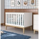 Berço Americano Classic New Branco Fosco Com Natural - MoveisaquiO Berço Americano Classic New - MóveisAqui possui um ar retrô que traz charme ao quartinho do seu baby, possui os pés em madeira maciça, com um desing atemporal combina com vários estilos de decoração. Além de poder transformar-se em mini cama, para que possa continuar a ser , mesmo a pós a transição do bebê.Dimensões do Produto Montado:Altura: 97 cmLargura: 135 cmProfundidade: 76 cmObservações:- Berço Certificado pelo INMETRO 002667/2018;- Transforma-se em mini cama;- Padrão Americano;- Cantos arredondados;- Acompanha suporte de mosquiteiro;- 03 regulagens de altura do estrado;- Colchão Recomendado: 130cm x 70cm x 12cm Densidade: D18 (colchão não incluso);- Pés na cor Madeira;- Pintura ultravioleta com acabamento fosco.