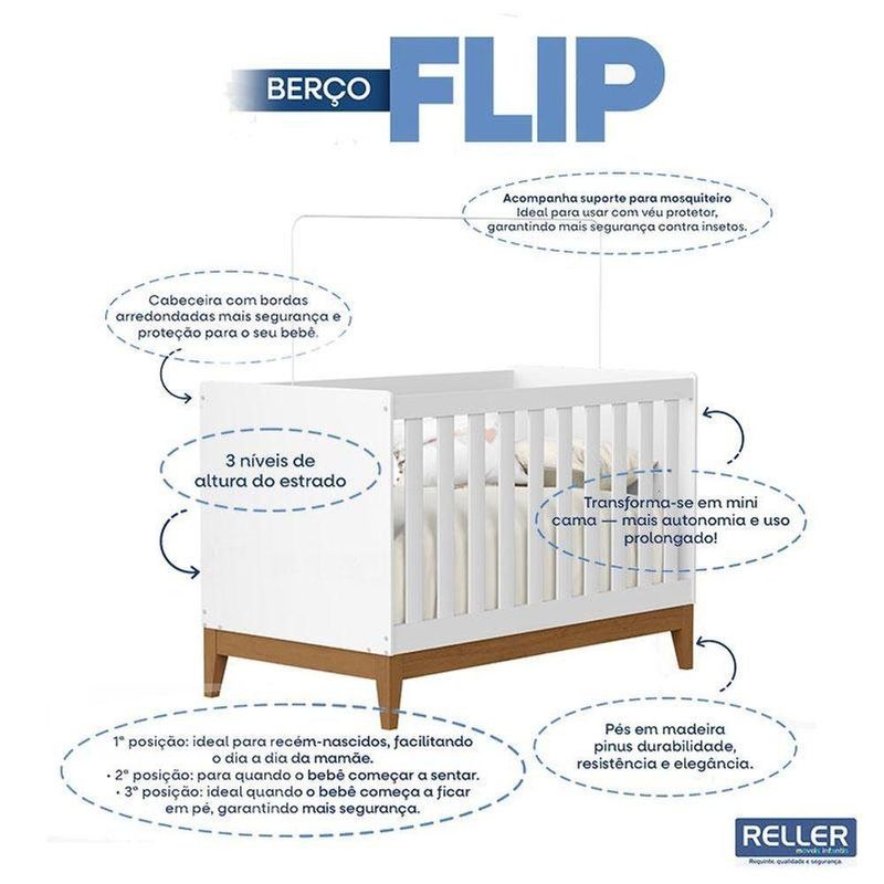 Berço Americano Flip Branco Acetinado Reller E Cômoda Infantil Americano Brando E Colchão Tendtudo - HennBerço Americano Flip Branco Acetinado Reller e Cômoda Infantil Americano Brando com Colchão TendTudo - HennConjunto Berço Americano Flip Reller Branco Acetinado e Cômoda Infantil Americano HennBranco , ideal para um quarto de bebê funcional e aconchegante. O berço oferece conforto e , enquanto a cômoda garante praticidade e ótima organização no dia a dia. Design moderno, excelente acabamento e a qualidade Reller e Henn para um ambiente bonito e prático. Acompanha Colchão TendTudo.Berço Americano Flip Branco Acetinado - RellerCaracterísticas Técnicas:- Puxadores em MDF revestido- Pintura na cor Branco Acetinado- Estrado com 3 posições de altura- Acompanha suporte para mosquiteiro- Design Moderno e Minimalista- Padrão americano- Pés em madeira resistentes-Colchão Recomendado:130cm x70cm (Vendido Separadamente);- Amplo espaço interno- Design modernoDimensões:Altura: 90 cmLargura: 133 cmProfundidade: 75 cmColchão para Berço Americano 130x70 cm - Tend Tudo MóveisCaracterísticas Técnicas:- Tecido plano- Espuma ível convencional poliuretana- Padrão Americano- Produto de origem - Carinho e conforto que o seu bebê mereceDimensões:Altura: 10 cmLargura: 70 cmProfundidade: 130 cmOBS: IMAGENS MERAMENTE ILUSTRATIVAS, CORES E ESTAMPAS PODEM VARIAR CONFORME LOTE.Cômoda Infantil Americano Branco – HennCaracterísticas Técnicas:- Desenvolvido em MDP/ MDF- Frentes em MDF com usinagem em baixo relevo- Pintura na cor Branco - Acabamento em U.V Fosco- 1 Porta- 4 Gavetas com corrediças telescópicas- Prateleiras internas- Puxadores na cor bronze- Lindo designDimensões:Altura: 101 cmLargura: 126 cmProfundidade: 51 cmInformações importantes:- Não acompanha decorações e acessórios- Nossas cargas possuem , portanto, no ato da , confira a quantidade de volumes recebida, e também o estado da embalagem. Se houver qualquer inconsistência, não assine o de ;- O armazenamento do produto no de é de responsabilidade do comprador. Evite apoiar o produto na vertical, bem como evite áreas que deixem o produto exposto a chuva ou umidade excessiva;- Pequenas variações de tonalidade são possíveis, em razão da diferença de resolução da tela onde o anúncio está sendo visualizado. Se notar diferença expressiva, comunicar a empresa antes de efetuar a montagem;- O de contratado contempla a até a primeira área coberta ou portaria, não sendo coberto o ato de subir escadas/elevadores ou adentrar nas residências;- Não nos responsabilizamos pela montagem, desmontagem ou instalação do produto.