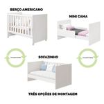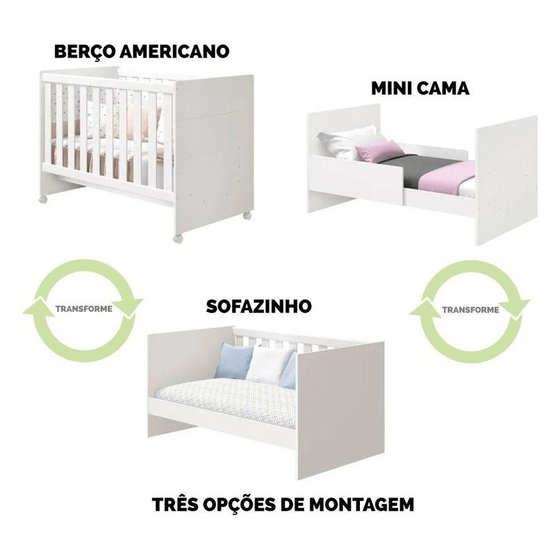 Berço Americano Katatau Branco Fosco - MoveisaquiCom um design contemporâneo e atemporal, o Berço Americano Katatau - MóveisAqui é perfeito para o seu baby. Pensando no uso prolongado, o mesmo ainda pode se transformar em mini-cama e também sofazinho, permitindo que seja possível utilizar no período de transição do seu bebê para a caminhaDimensões do Produto Montado:Altura: 97 cmLargura: 133 cmProfundidade: 78 cmObservações:- Berço Certificado pelo INMETRO 000826/2016;- Transforma-se em mini cama e sofazinho;- Padrão Americano;- Cantos arredondados;- 03 regulagens de altura do estrado;- Grade MDF 18mm;- 04 Rodízios, sendo 02 Rodízios com trava;- Acompanha suporte para mosquiteiro;- Colchão Recomendado:130cm x 70cm x 12cm. Densidade: D18 (colchão não incluso);- Pintura ultravioleta com acabamento fosco.