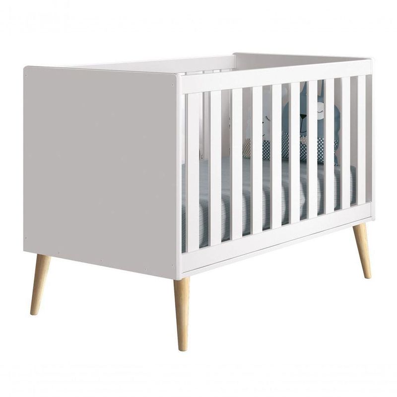 Berço Americano Théo New Branco Fosco Com Natural - MoveisaquiO Berço Americano Theo New - MóveisAqui exala personalidade e delicadeza no seu estilo retrô, possui os pés em madeira maciça no estilo palito, com um desing clean combina com vários estilos de decoração. Além de poder transformar-se em mini cama, para que possa continuar a ser usado, mesmo após a transição do bebê.Dimensões do Produto Montado:Altura: 95 cmLargura: 135 cmProfundidade: 76 cmObservações:- Berço Certificado pelo INMETRO 002666/2018;- Transforma-se em mini cama;- Padrão Americano;- Cantos arredondados;- Acompanha suporte de mosquiteiro;- 03 regulagens de altura do estrado;- Colchão Recomendado: 130cm x 70cm x 12cm Densidade: D18 (colchão não incluso);- Pés na cor Natural;- Pintura ultravioleta com acabamento fosco;