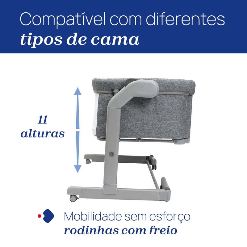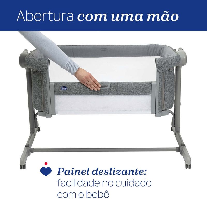 Mantenha seu bebê sempre pertinho e garanta noites mais tranquilas para toda a família com o Berço Next2Me Magic Evo Chicco. Especialmente projetado para o co-sleeping, ele permite que seu pequeno durma ao seu lado, reforçando o vínculo e tornando as mamadas noturnas muito mais práticas.O modo de balanço, ativado com um simples gesto, proporciona momentos de relaxamento e ajuda seu bebê a adormecer com mais facilidade. A barreira lateral deslizante, que pode ser aberta com apenas uma mão, garante acesso rápido e seguro em qualquer momento da noite.Com 11 níveis de altura ajustáveis e pés dobráveis, o Next2Me Magic Evo se adapta à maioria das camas, enquanto as duas laterais em malha e o colchão 3D respirável asseguram ventilação constante e conforto extra. Para maior praticidade, conta com 4 rodas giratórias com freios, permitindo movimentar o berço pela casa sem esforço.Mais conforto, segurança e proximidade para os primeiros meses do seu bebê!Imagens meramente ilustrativas