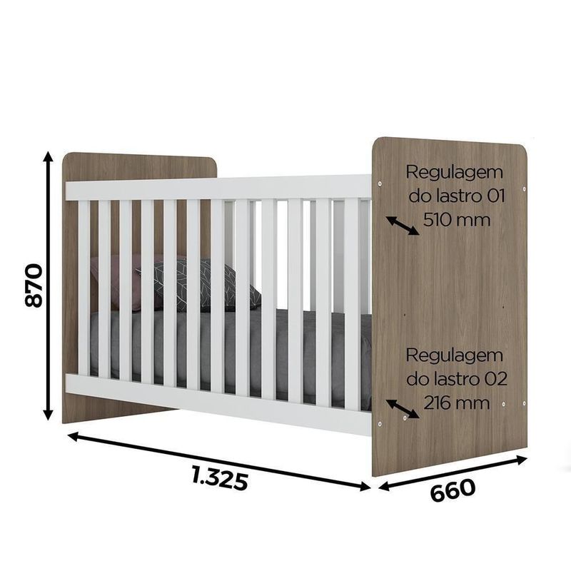 Berço Labirinto Rústico/branco - Móveis Henn Rústico/branco Berço Labirinto - Móveis Henn O Berço Labirinto foi desenvolvido com materiais alto padrão para proporcionar conforto e segurança para seu bebê. Seu lindo design remete modernidade ao ambiente. Perfeito para completar a beleza do quartinho do seu filho com estilo.ESPECIFICAÇÕES: - Estrutura em MDP/MDF - Pintura UV (atóxica) - Padrão brasileiro - Grades Fixas em MDF - 2 Regulagens de altura do estrado - Estrado em MDF - Colchão recomendado 130 x 60 cm - Certificado pelo INMETRO 001 087/2020 - Não acompanha colchão Dimensões: Tamanho do Produto (L x A x P): 132,5 x 87 x 66 cm Garantia: 3 meses Montagem: O Produto vai desmontado com manual e todos acessórios. Recomendamos que a montagem seja feita por um profissional Recomendação de Limpeza: Utilize pano levemente úmido Observações: - A LOJA se responsabilizará pela entrega dos produtos até aonde as rodovias alcançam, entregas fluviais ou aéreas devem ser cotadas a parte. - As imagens são ilustrativas, não acompanham objetos de decoração. - Pode haver alguma diferença de tonalidade entre a imagem e o produto, por conta do tratamento de imagens e a calibração de cores da sua tela. - A montagem será de responsabilidade do comprador. Entregamos até a porta de entrada da residência ou até a portaria do condomínio. Não nos responsabilizamos, no ato da entrega, por subir escadas/elevadores ou transporte por guincho em apartamentos. Eventuais despesas são de responsabilidade do comprador. - Confira as dimensões do produto no momento da compra e certifique-se de que passará normalmente por supostos elevadores, portas, escadas e/ou corredores de sua residência. Para mais informações, acesse nossa Central de Atendimento. Produto: Berço | Portátil: Não | Certificação do Inmetro: 001087/2020 | Regulamentado pelo Inmetro: Sim | Fabricante: Henn | Inclui manual de montagem: Sim | Com gaveteiro: Não Cor: Rústico/Branco