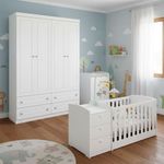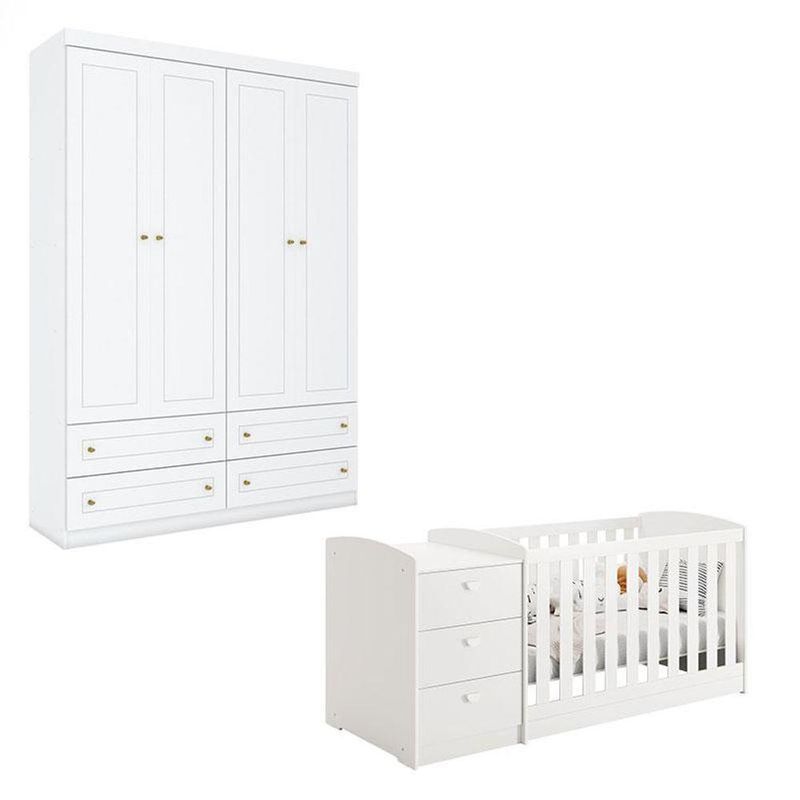 Berço Multifuncional Atlanta E Guarda Roupa 4 Portas Americano Ambiente Branco Fosco Henn - RellerBerço Multifuncional Atlanta e Guarda Roupa 4 Portas Americano Ambiente Branco Fosco Henn - RellerNa hora de mobiliar o quarto do bebê, a escolha de móveis que combinam conforto e praticidade faz toda a diferença.! Apresentamos o Berço Multifuncional Atlanta da Reller e o Guarda Roupa 4 Portas Americano desenvolvido pela Henn. Berço padrão Americano, cômoda acoplada, gavetas com corrediças telescópicas e com 3 opções diferentes de montagem de mini cama podendo acompanhar o desenvolvimento da criança e utilizar por muito tempo. O Guarda Roupa Americano possui um design robusto, cabideiros em alumínio e puxadores em ABS na cor bronze. Confira mais detalhes abaixo e não deixe de adquirir produtos fabricados com a mais alta qualidade! Características Técnicas Berço Multifuncional Atlanta: - Pintura na cor Branco - Acabamento UV fosco - Sistema de pintura atóxica que não faz mal ao bebê - Berço padrão americano - Grade fixa - 3 opções de mini cama - Cômoda podendo ser montada em ambos os lados - Gavetas com corrediças telescópicas - Puxadores em PVC - Possui travas de segurança - Possui 3 gavetas - Utiliza colchão 130x70cm (vendido separadamente) - Lindo designDimensões:Altura: 85 cm Largura: 185 cm Profundidade: 77 cm Guarda Roupa Americano 4 Portas: - Desenvolvido em MDP/ MDF - Frentes em MDF - Acabamento em U.V Fosco - 4 Portas - 4 Gavetas com corrediças telescópicas - Portas e gavetas com usinagem em baixo relevo - Puxadores em ABS na cor bronze - Cabideiro em alumínio - Lindo design Dimensões: Altura: 218 cm Largura: 155 cm Profundidade: 49 cm Informações importantes: - Nossas cargas possuem seguro, portanto, no ato da entrega, confira a quantidade de volumes recebida, e também o estado da embalagem. Se houver qualquer inconsistência, não assine o comprovante de entrega; - O armazenamento do produto no endereço de entrega é de responsabilidade do comprador. Evite apoiar o produto na vertical, bem como evite áreas que deixem o produto exposto a chuva ou umidade excessiva; - Pequenas variações de tonalidade são possíveis, em razão da diferença de resolução da tela onde o anúncio está sendo visualizado. Se notar diferença expressiva, comunicar a empresa antes de efetuar a montagem; - O serviço de entrega contratado contempla a entrega até a primeira área coberta ou portaria, não sendo coberto o ato de subir escadas/elevadores ou adentrar nas residências; - Não nos responsabilizamos pela montagem, desmontagem ou instalação do produto.