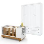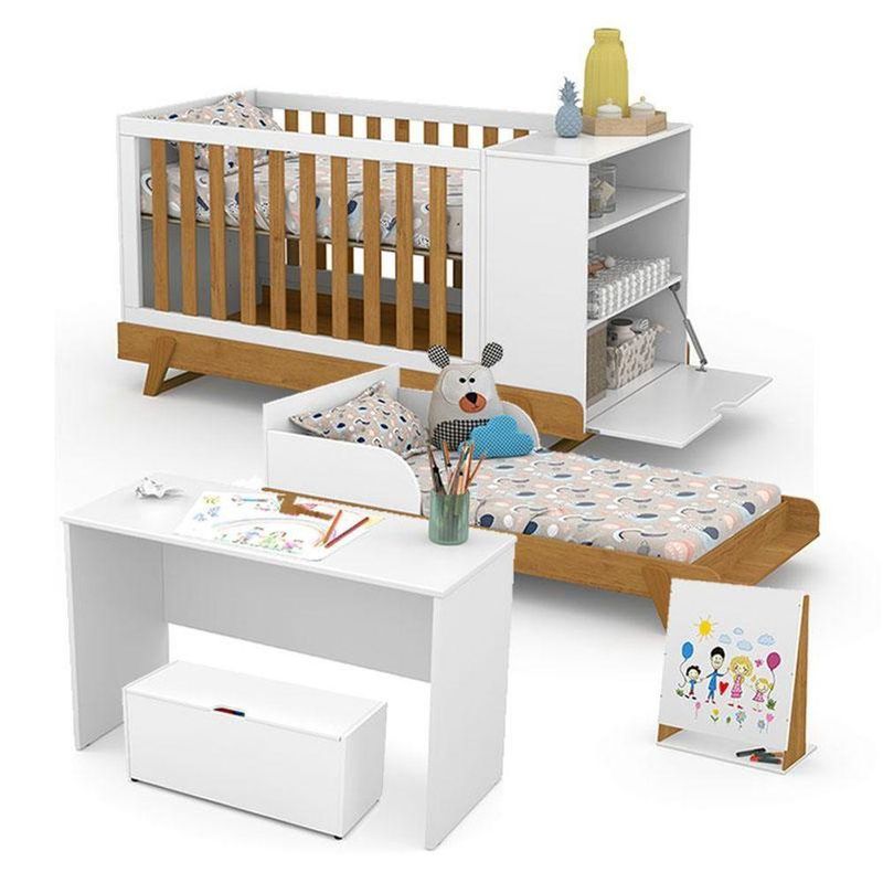 Berço Multifuncional Bkids Branco Freijó Eco Wood - Matic E Guarda Roupa Infantil Americano 4 Porta Branco Hp - HennBerço Multifuncional Bkids Branco Freijó Eco Wood - Matic e Guarda Roupa Infantil Americano 4 Porta Branco HP - HennConjunto infantil composto por Berço Multifuncional Bkids Branco Freijó Eco Wood Matic e Guarda-Roupa Infantil Americano 4 Portas Branco HP Henn. O berço multifuncional pode ser utilizado em diferentes fases do crescimento, oferecendo praticidade, segurança e conforto. O guarda-roupa possui 4 portas e bom espaço interno para organização de roupas e acessórios. Ideal para um quarto de bebê funcional, moderno e aconchegante.Berço Multifuncional Bkids Branco Freijó Eco Wood - MaticCaracterísticas Técnicas:- Desenvolvido em MDF- Pintura na cor Branco Soft Freijó Eco Wood- Pés em detalhe de madeira- Grades fixas com detalhe na cor Freijó- 03 regulagens de altura do estrado para facilitar o acesso a criança- Transforma-se em:Mini cama ultiliza colchão de 70x130 cmCama Junior ultiliza colchão de 70x150 cm ( Vendido Separadamente)Mesa kids para desenhar e se divertirBaú para organizar brinquedos e pertencesLousa para para desenho, exclusivo acabamento amadeirado- Certificado pelo INMETRO- Maior praticidade e segurança- Lindo DesignDimensões:Altura: 88 cmLargura: 165 cmProfundidade: 83 cmGuarda Roupa Infantil Americano 4 Portas Branco HP – HennCaracterísticas Técnicas:- Desenvolvido em MDP/ MDF- Frentes em MDF- Acabamento em U.V Fosco- 4 Portas- 4 Gavetas com corrediças telescópicas- Portas e gavetas com usinagem em baixo relevo- Puxadores em ABS na cor bronze- Cabideiro em alumínio- Lindo designDimensões:Altura: 218 cmLargura: 155 cmProfundidade: 49 cmInformações importantes:- Nossas cargas possuem seguro, portanto, no ato da entrega, confira a quantidade de volumes recebida, e também o estado da embalagem. Se houver qualquer inconsistência, não assine o comprovante de entrega;- O armazenamento do produto no endereço de entrega é de responsabilidade do comprador. Evite apoiar o produto na vertical, bem como evite áreas que deixem o produto exposto a chuva ou umidade excessiva;- Pequenas variações de tonalidade são possíveis, em razão da diferença de resolução da tela onde o anúncio está sendo visualizado. Se notar diferença expressiva, comunicar a empresa antes de efetuar a montagem;- O serviço de entrega contratado contempla a entrega até a primeira área coberta ou portaria, não sendo coberto o ato de subir escadas/elevadores ou adentrar nas residências;- Não nos responsabilizamos pela montagem, desmontagem ou instalação do produto.